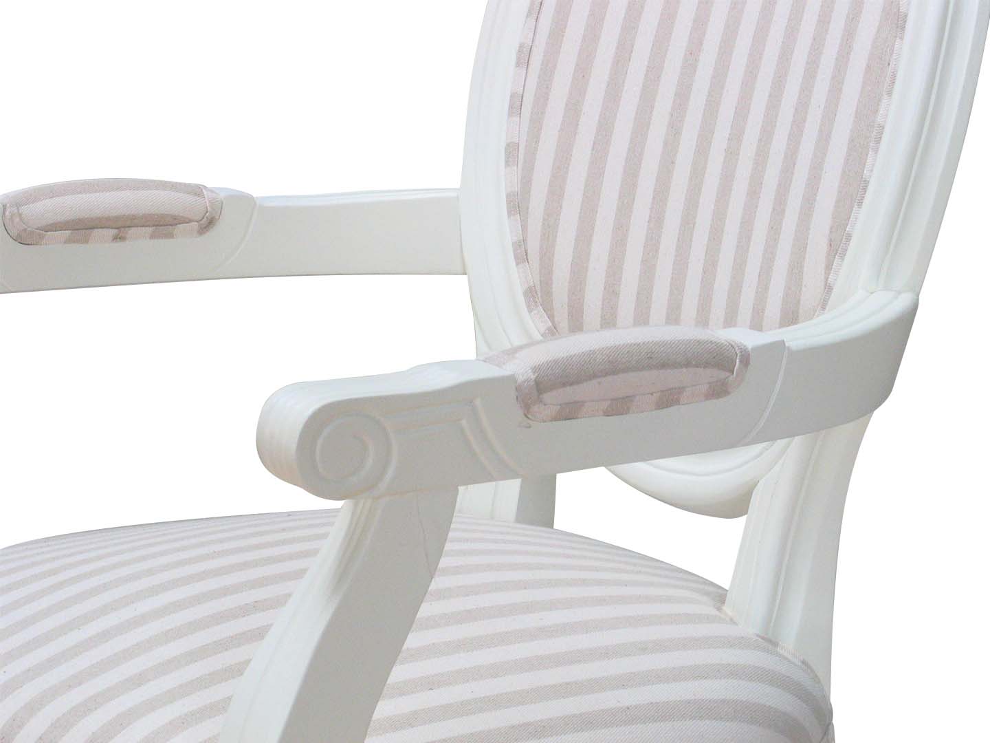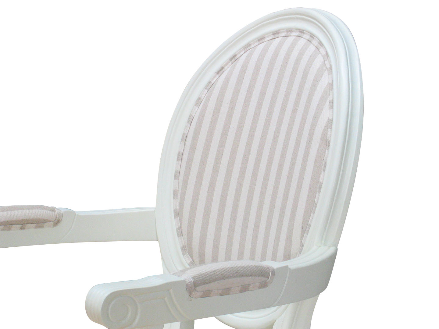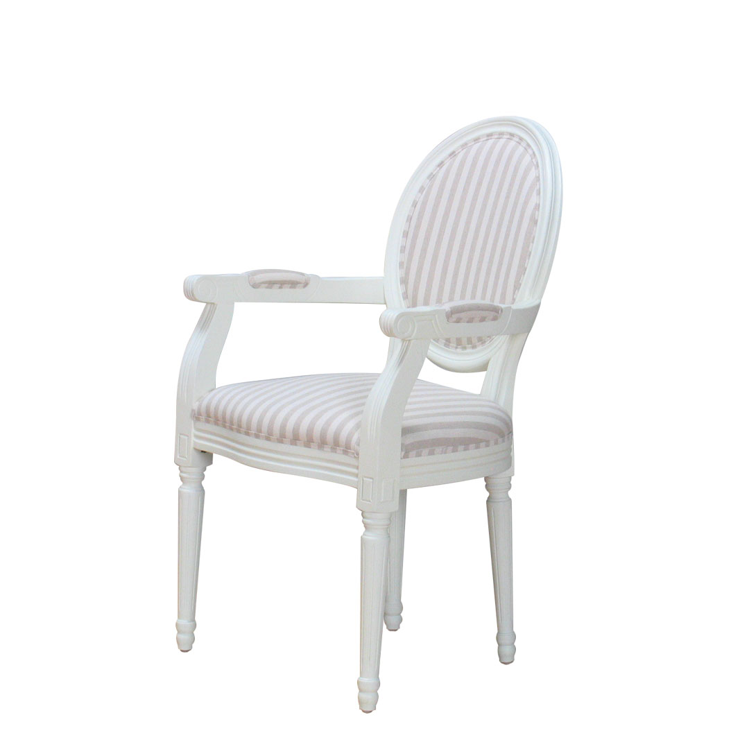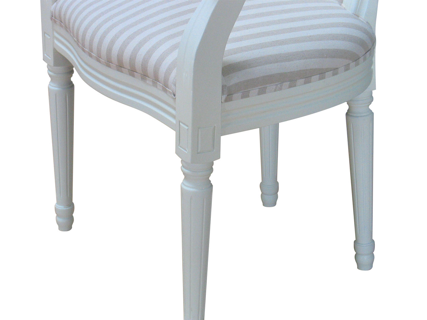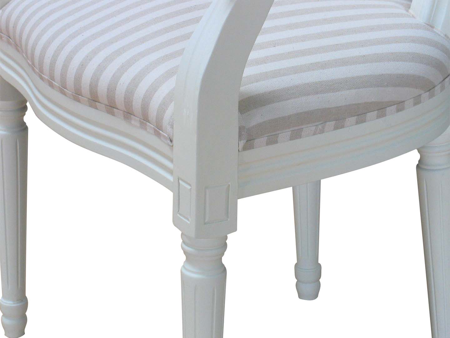 La chaise de salle à manger Rococo/Amaretta avec accoudoirs en blanc antique, patinée antique avec tissu rayé beige est une chaise de table à manger de couleur blanche qui apporte à la fois style et fonctionnalité à votre maison. Belle chaise classique de style romantique avec accoudoirs en blanc antique et tissu rayé beige. Vous pouvez également obtenir la chaise dans d'autres couleurs avec et sans accoudoirs. Chaque chaise est fabriquée à la main, ce qui donne à chaque chaise un look unique. Du siège à l'accoudoir supérieur : 19,5 cm. Meuble solide de qualité avec âme. Design élégant avec patine antique. Un meuble de qualité, élégant, charmant et solide. Ce produit a été créé avec un souci du détail, qui garantit à la fois un attrait esthétique et une grande durabilité. Il est conçu dans un souci à la fois de fonctionnalité et de style, ce qui en fait le choix parfait pour n’importe quelle pièce de votre maison. Les matériaux utilisés sont de haute qualité, ce qui confère au produit une longue durée de vie et lui permet de résister à une utilisation quotidienne. Que ce soit pour le rangement ou comme ajout décoratif, ce produit rehaussera votre décor et apportera plus de confort et d'élégance à votre maison.
