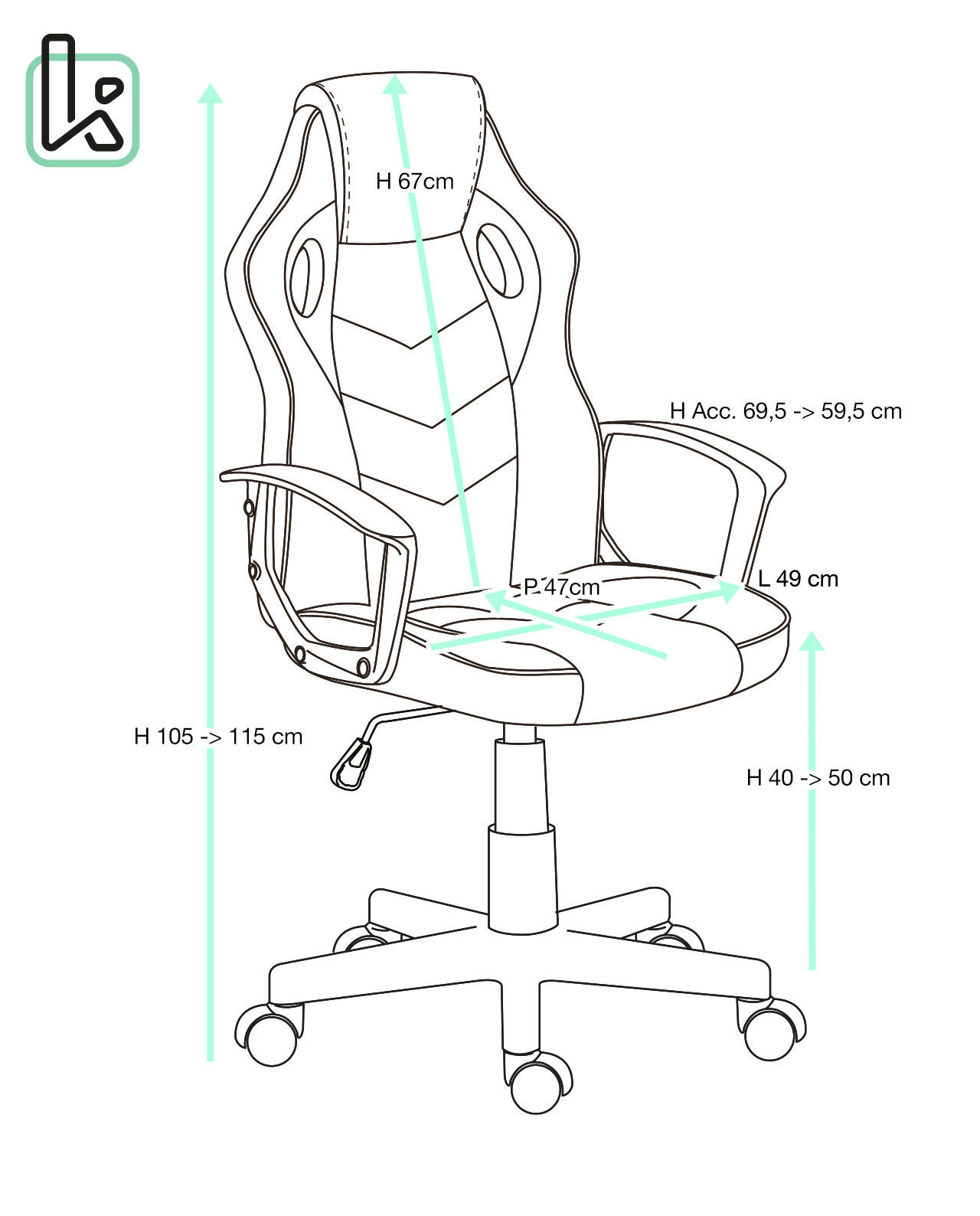 - Hauteur d'assise : +/- 40 –>50 cm