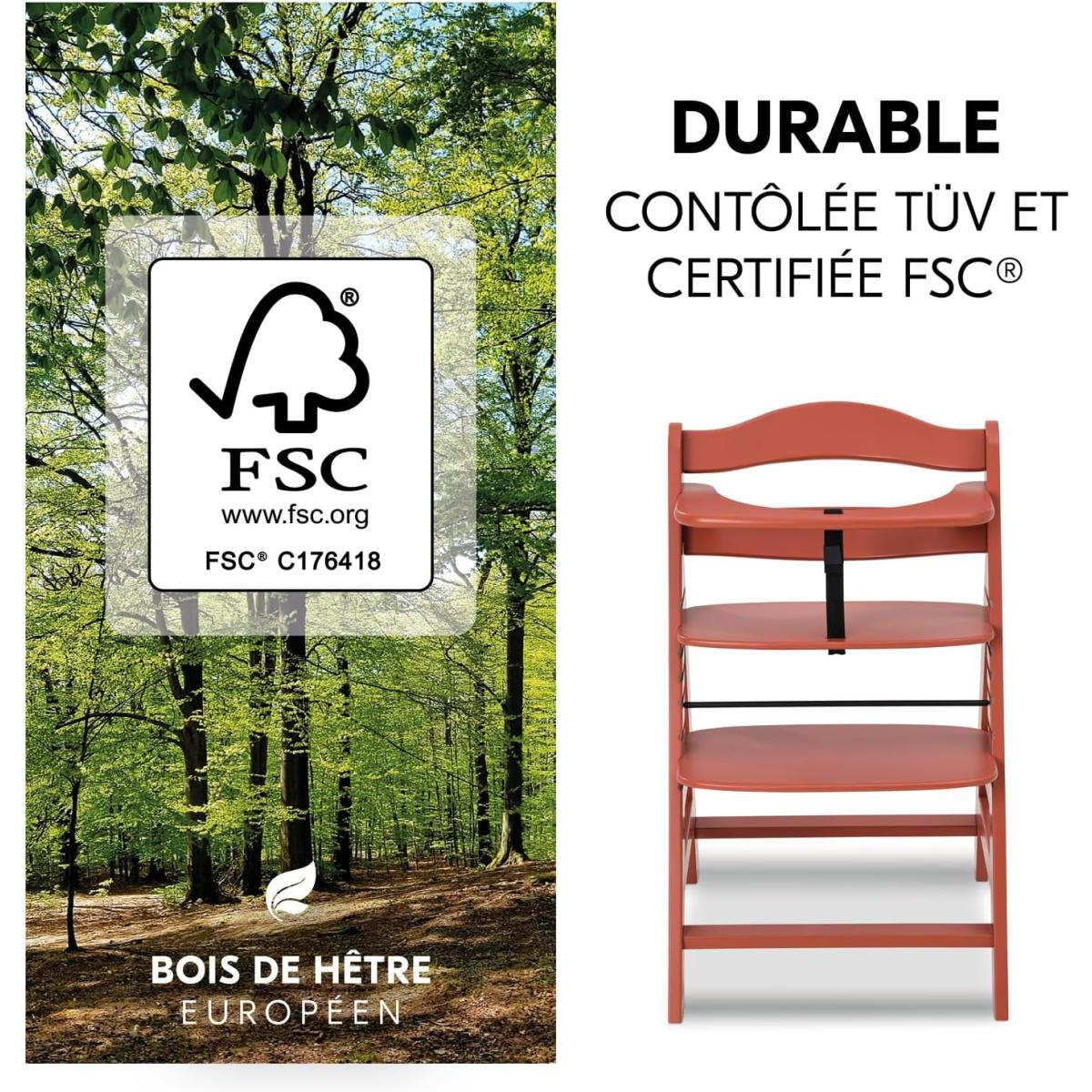 Alpha+ - La chaise haute en bois qui grandit toute savie Compagnon à vie en bois durableL'Alpha+ est fabriqué à partir de bois de hêtre européen provenant de forêts certifiées FSC®. Nous attachons une grande importance à une exploitation durable et écologique des forêts qui protège les plantes et les animaux. Grâce à la plaque d'assise et de pied réglable. la chaise haute d'escalier s'adapte à la taille de votre enfant et permet une position assise confortable à tout âge. La chaise haute s'adapte également avec des branches sous presque toutes les tables et est un compagnon fiable avec une charge maximale de 90 kg - toute une vie.Particulièrement stable pour des repas sûrsLa construction stable avec des patins au sol rend l'Alpha+ résistant au basculement. La ceinture à 5 points et la sangle d'entrejambe assurent une sécurité supplémentaire. Les deux systèmes de ceinture sont toujours fournis et sont compatibles avec les accessoires tels que les coussins de siège. Pour les jeunes enfants. la barre de protection avant est indispensable. Plus tard. vous pouvez le retirer pour que votre enfant puisse s'asseoir à la salle à manger ou au bureau.Confort dès la naissance avec des accessoires flexiblesCombiné avec les accessoires pour bébé Alpha Bouncer. qui peuvent également être utilisés comme transat. votre bébé est à égalité avec la famille dès le début. Vous pouvez compléter l'Alpha+ avec différentes planches. des coussins pour chaise haute. des réducteurs de siège. des boîtes de rangement et un plateau de jeu personnalisable.