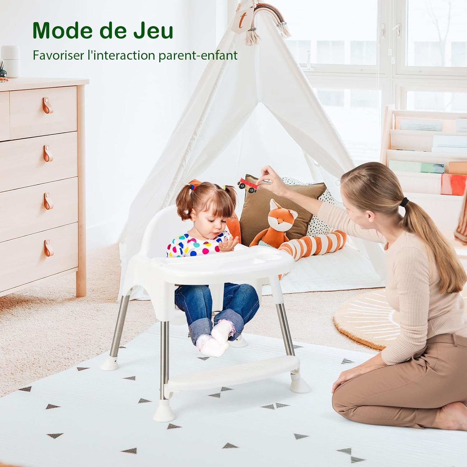 Cette chaise 4-en-1 peut être transformée en chaise haute pour nourrissons, chaise haute, chaise basse pour manger et chaise basse. Il convient aux enfants de différents âges et peut accompagner les enfants de 6 mois à 3 ans à grandir. De plus, cette chaise pour bébé est livrée avec un plateau alimentaire supérieur et un plateau inférieur pour jouer. En outre, le plateau est facilement amovible et lavable au lave-vaisselle. La ceinture de sécurité à 3 points peut fixer fermement l'enfant au siège pour assurer sa sécurité. Notre chaise haute grandit avec votre enfant. N’hésitez pas à l’acheter.
