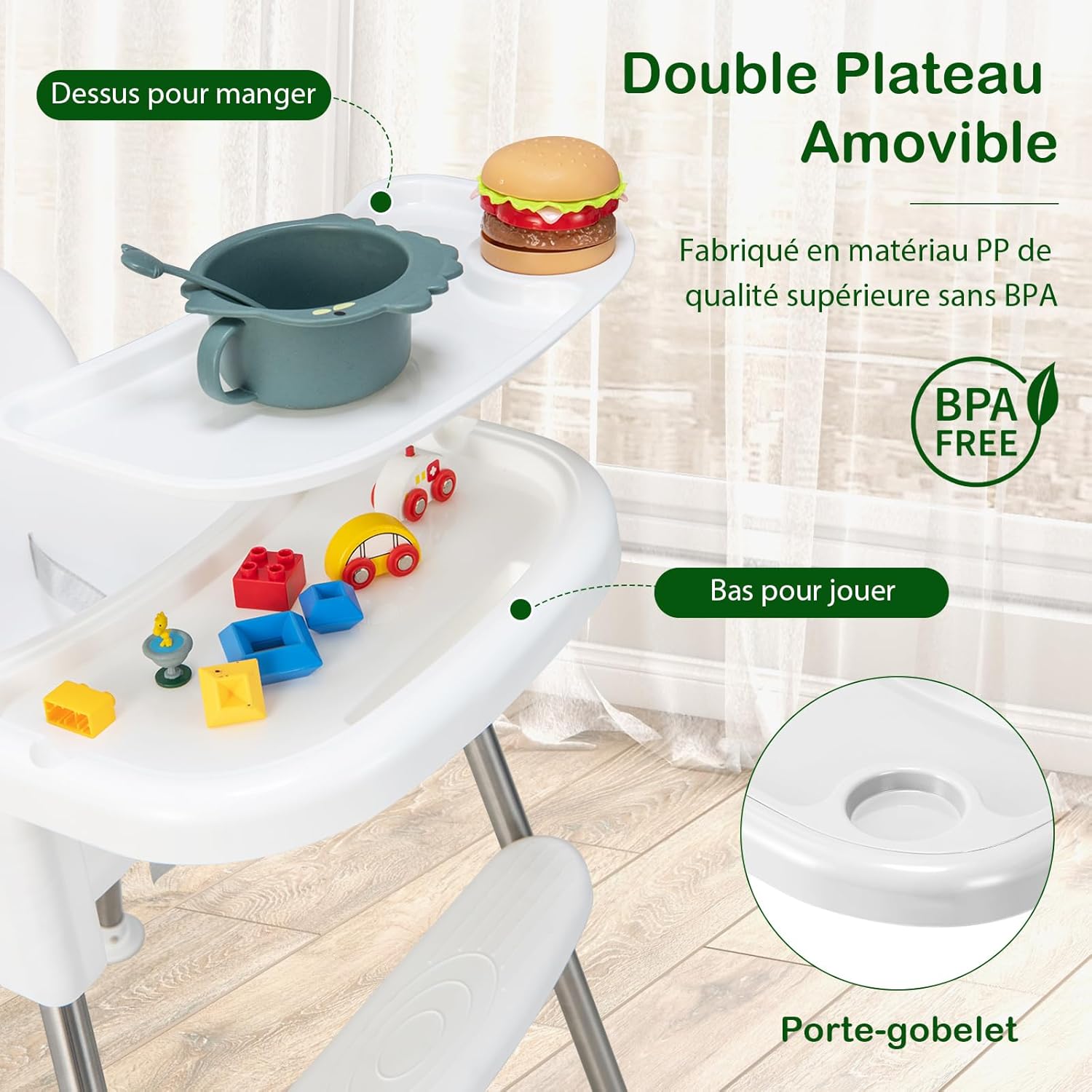 - Double Plateau Amovible : Le siège d'appoint à manger avec un double plateau en PP comestible. Le plateau supérieur peut placer les biberons et les bols, ce qui est parfait pour se nourrir ou manger. Tandis que, le plateau inférieur pour des jouets est adapté pour jouer. De plus, le double plateau est amovible, lavable au lave-vaisselle.