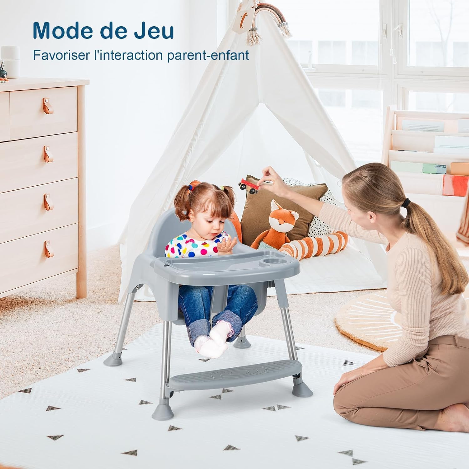 Cette chaise 4-en-1 peut être transformée en chaise haute pour nourrissons, chaise haute, chaise basse pour manger et chaise basse. Il convient aux enfants de différents âges et peut accompagner les enfants de 6 mois à 3 ans à grandir. De plus, cette chaise pour bébé est livrée avec un plateau alimentaire supérieur et un plateau inférieur pour jouer. En outre, le plateau est facilement amovible et lavable au lave-vaisselle. La ceinture de sécurité à 3 points peut fixer fermement l'enfant au siège pour assurer sa sécurité. Notre chaise haute grandit avec votre enfant. N’hésitez pas à l’acheter.