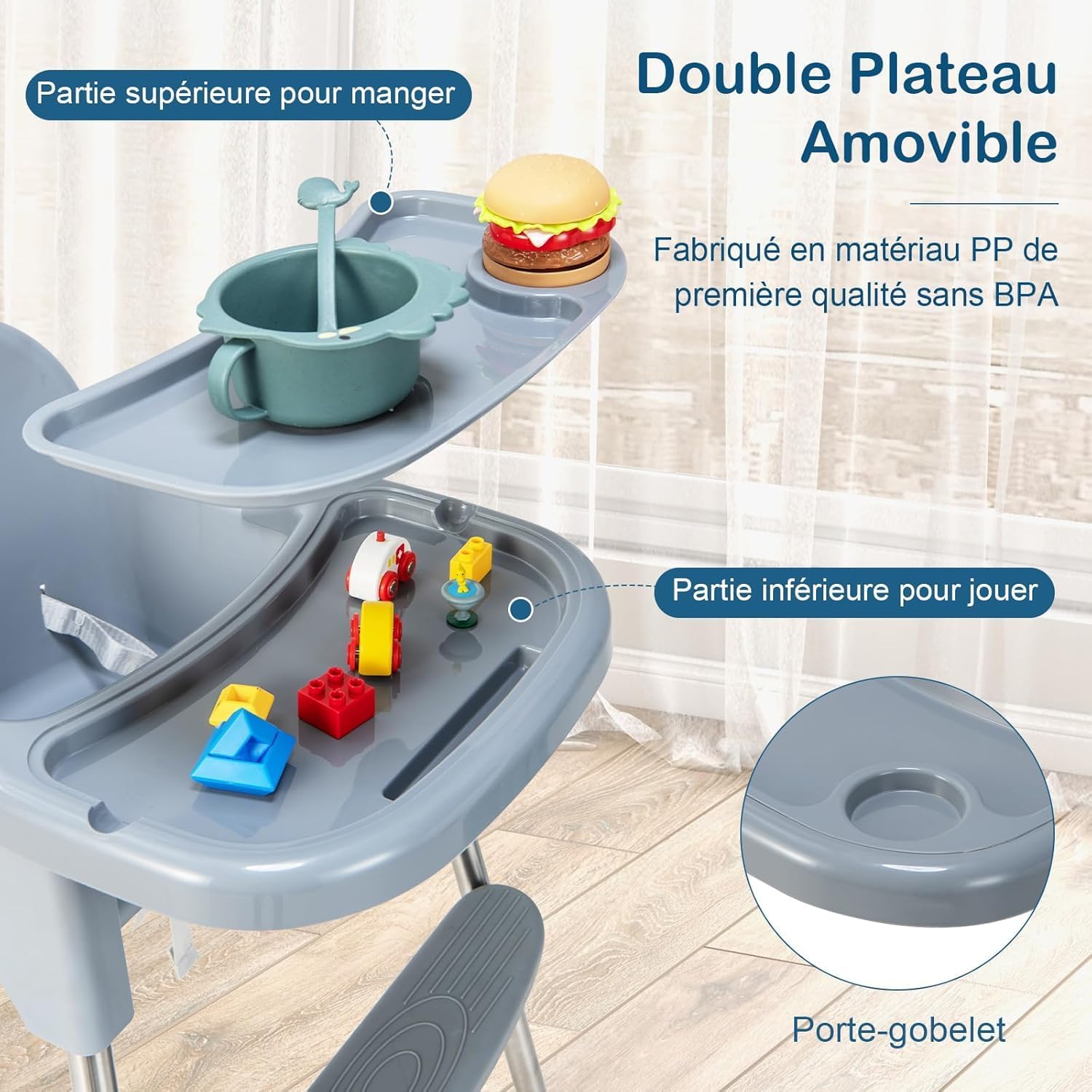 - Double Plateau Amovible : Le siège d'appoint à manger avec un double plateau en PP comestible. Le plateau supérieur peut placer les biberons et les bols, ce qui est parfait pour se nourrir ou manger. Tandis que, le plateau inférieur pour des jouets est adapté pour jouer. De plus, le double plateau est amovible, lavable au lave-vaisselle.