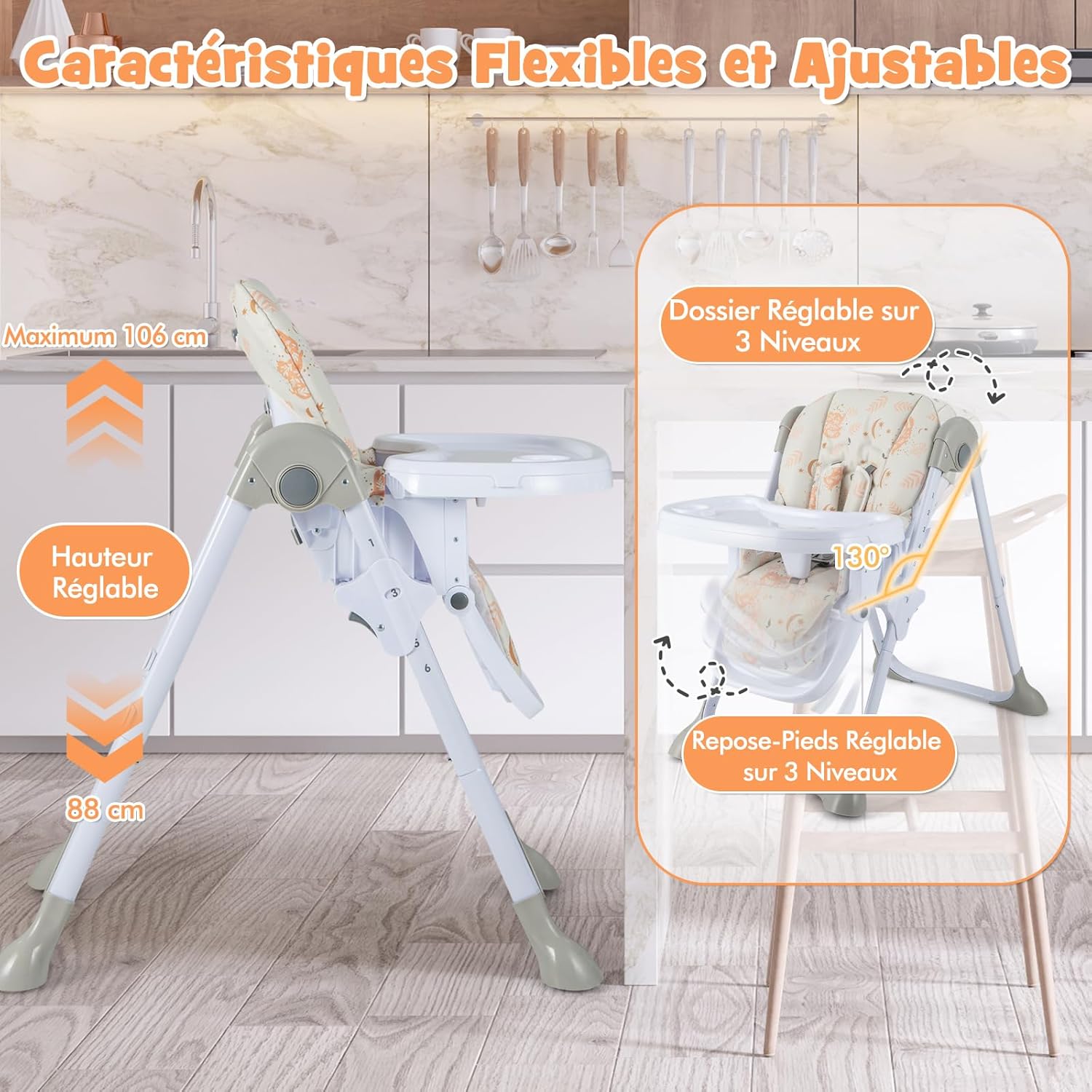 - Conception ergonomique : La chaise haute pliable offre 3 positions pour le dossier réglable, 3 positions pour le repose-pieds et 6 hauteurs d'assise différentes. De cette façon, vous pouvez ajuster la taille qui convient le mieux à la taille et à la forme de votre enfant pour profiter d'un confort optimal.