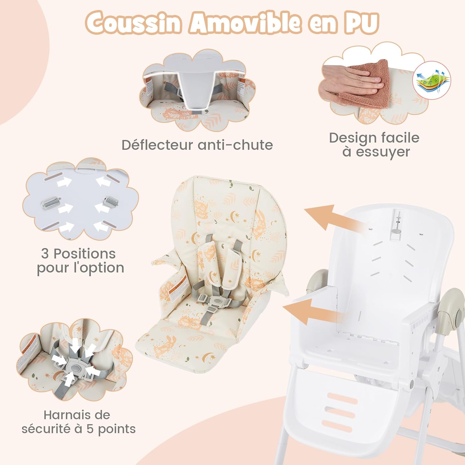 - Facile à nettoyer: Cette chaise haute facile à nettoyer dispose d'un plateau amovible et lavable au lave-vaisselle. De plus, les coussins sont fabriqués en matériau PU amovible et peuvent être essuyés avec un simple chiffon.