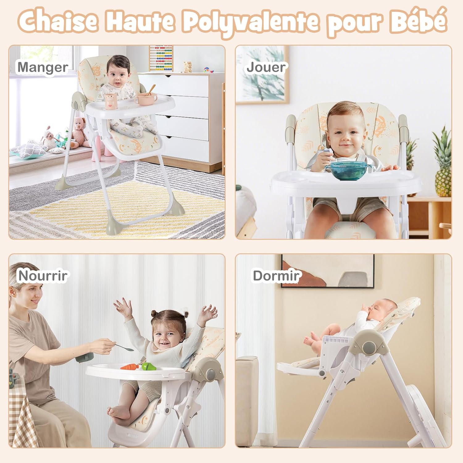 | Libellé | Chaise haute bébé, chaise haute pliable réglable avec plateau amovible, dossier ergonomique,beige |