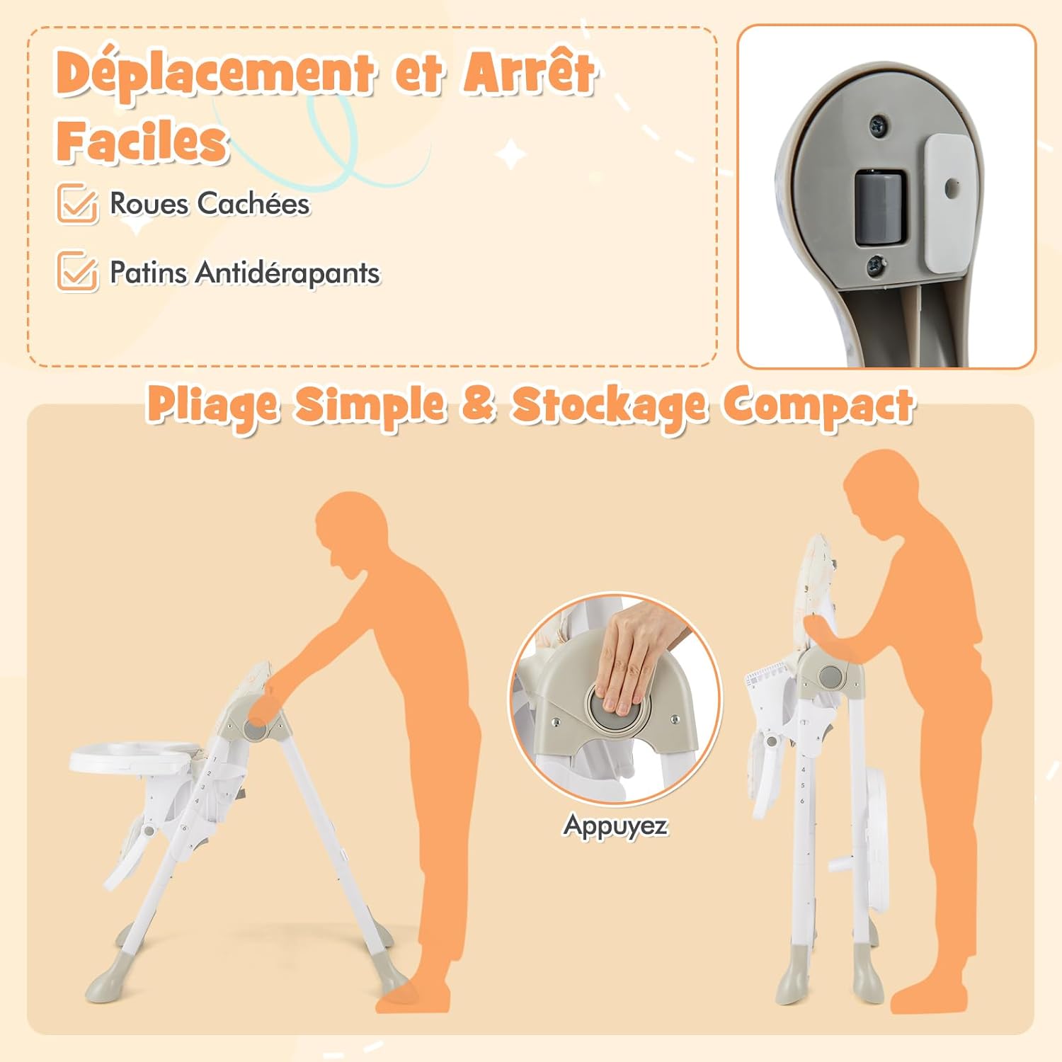 - Conception compacte : Avec des boutons faciles à presser, la chaise haute se plie en quelques secondes, ce qui permet à la chaise haute de votre enfant de prendre très peu de place. Les roues avant facilitent le déplacement de cette chaise haute pour enfants n'importe où pour manger, et les patins de pied arrière antidérapants permettent un arrêt stable.