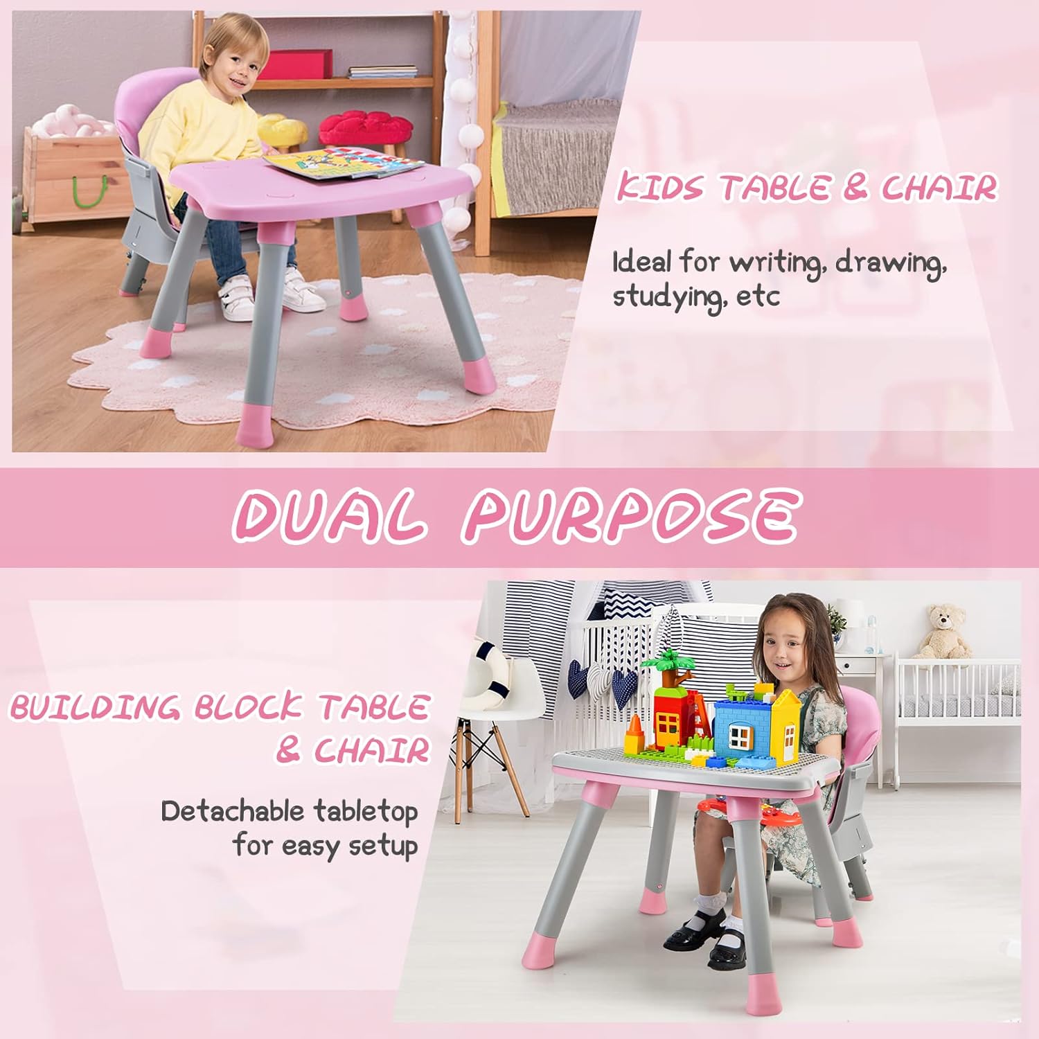 - Design unique: Les enfants peuvent écrire, dessiner ou lire sur le bureau avec chaise pour développer leur capacité d'apprentissage autonome. Pendant votre temps libre, vous pouvez également installer une table de construction (blocs non inclus) et jouer aux blocs avec vos enfants pour stimuler leur imagination et leur créativité.