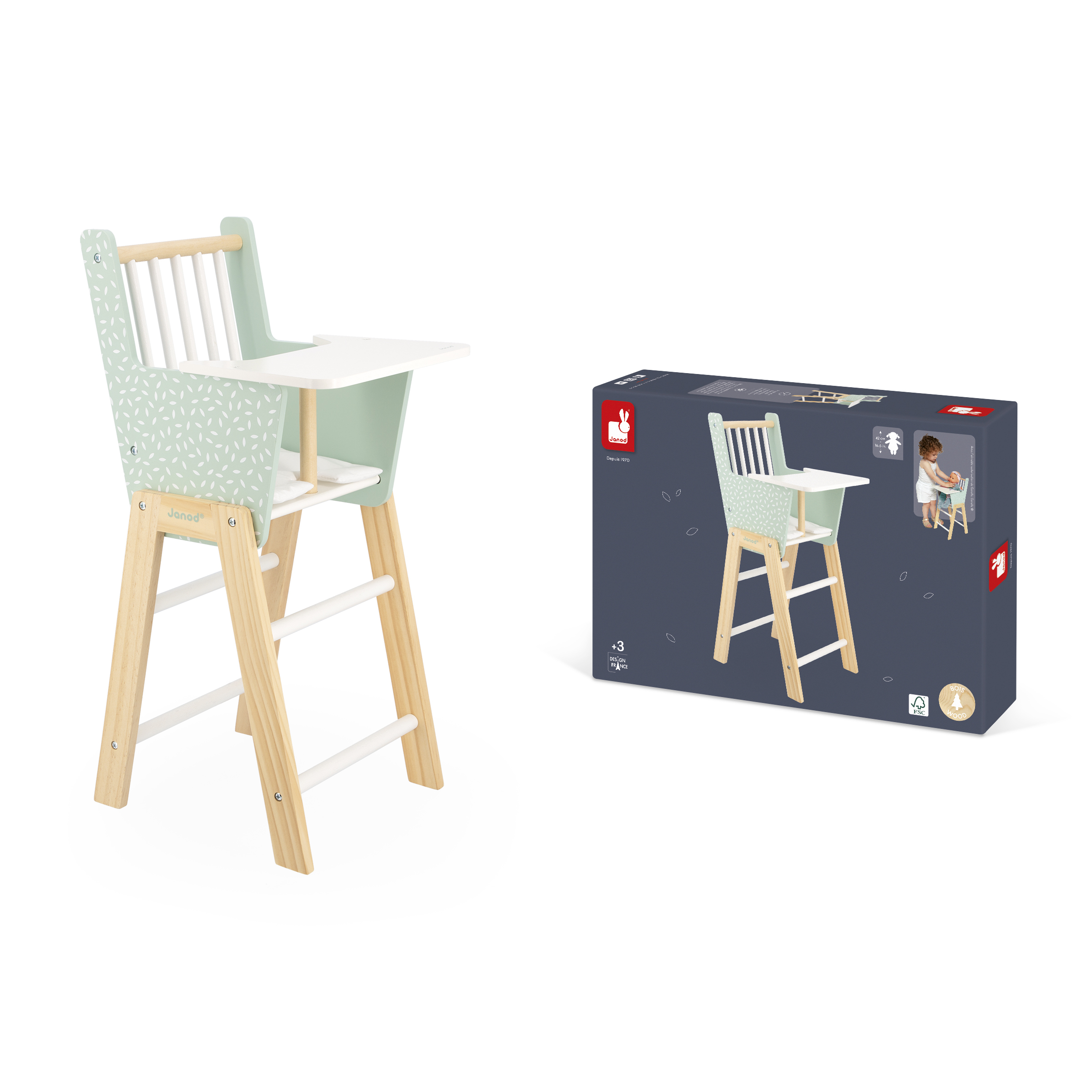 | Libellé | Chaise haute en Bois - Hauteur 53 cm. Livré avec 1 Coussin - Pour Poupons jusqu'à 42 cm - Jouet d'Imitation en Bois FSCTM |