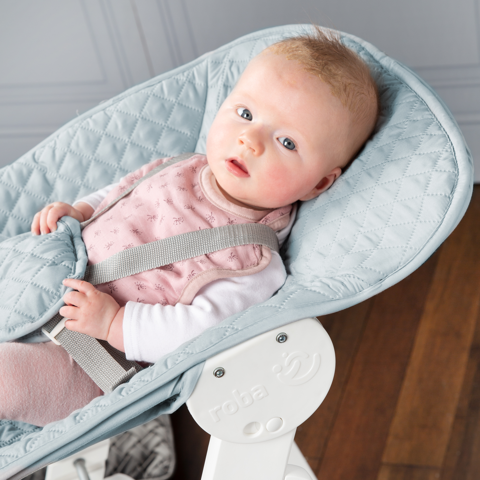 L'ensemble de chaises hautes 2-en-1 avec transat pour nouveau-né roba "Born Up" est le compagnon idéal pour votre enfant jusqu'à l'adolescence. L'ensemble se compose de la chaise haute et du transat pour nouveau-né. La chaise haute avec position de sommeil et d'alimentation offre un confort d'assise ergonomique. Le transat peut être réglé en deux positions et convient aux bébés de 0 à 6 mois. Poids maximal : 9 kg. La chaise haute "grow-along" grandit avec votre enfant après le simple retrait de la barre de protection et du système de ceinture de sécurité en ajustant progressivement la hauteur du siège et du pied de lit amovibles. La chaise haute avec ceinture à 5 points est conçue conformément à la norme actuelle EN 12790:2009, la chaise haute avec ceinture à 3 points est conçue conformément à la norme actuelle DIN EN 14988:2017 en Allemagne. La chaise haute ROBA (une fois transformée en chaise) peut supporter jusqu'à 50kgs. Convient à partir de la naissance. Chaise haute: (H x L x P) 80 x 44,5 x 54 cm. Hauteur d'assise max. 55 cm, min. 42 cm. Housse lavable à 40 ° C.