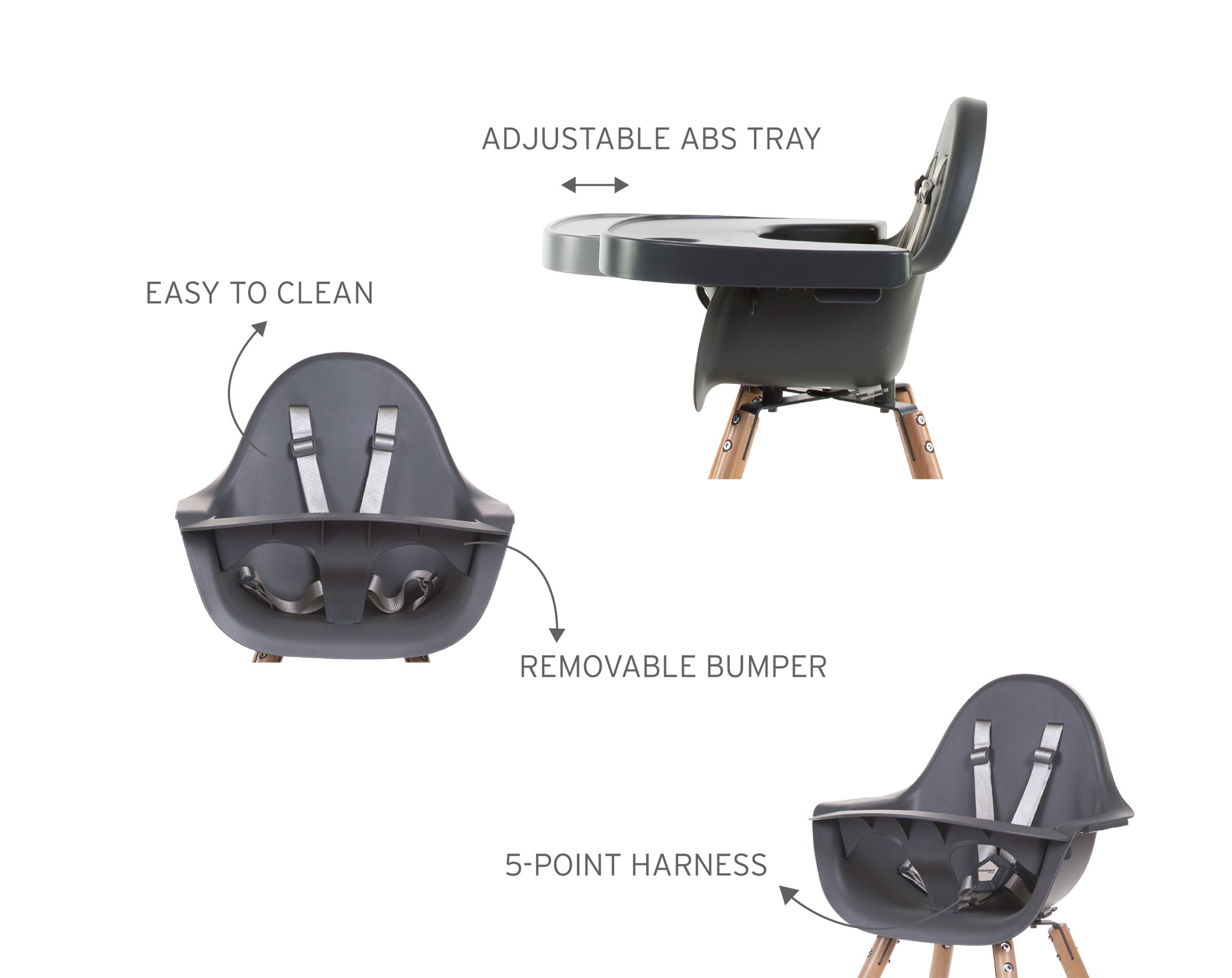 Chaise haute EVOLU 2 toute dernière génération, conception innovante et ingénieuse. Son avantage : La toute 1ère chaise haute bébé qui s'adapte à 3 hauteurs de table : - table à 50 cm : petite table de jeux - table à 72 cm : hauteur standard table salle à manger - table à 90cm : table à la hauteur du plan de travail dans une cuisine (avec le kit de pieds en option) Chaque pied bénéficie d'un tampon caoutchouc anti-dérapant et réglable en hauteur, afin d'optimiser la stabilité de la chaise haute bébé EVOLU. Equipée d'un harnais 5 points d'attache, ajustable de 6 à 36 mois, et amovible pour enfants de plus de 36 mois. Equipée aussi d'un repose-pieds et d'un garde-corps de sécurité pour passer les jambes, avec un large accoudoir. Dimensions: 56 x 56 x 92 cm Composition: Chaise: Polypropylène - Pieds: Hêtre EN-Norme: EN 14988:2017 Entretien: Nettoyer avec un chiffon imbibé d'un détergent doux. Terminer en essuyant avec un chiffon sec. Couleur : Naturel/Anthracite