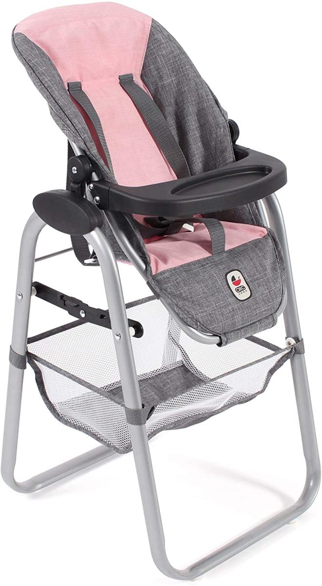 Chaise haute de poupée avec plateau amovible. Large et stable. Avec siège réglable. Le siège est amovible et a une sangle de transport à l'arrière, de sorte qu'il peut également être utilisé comme sac à dos. Pour poupées jusqu'à 50 cm. Dimensions?: 36 x 35 x 73 cm (Hauteur d'assise: env. 42 cm)