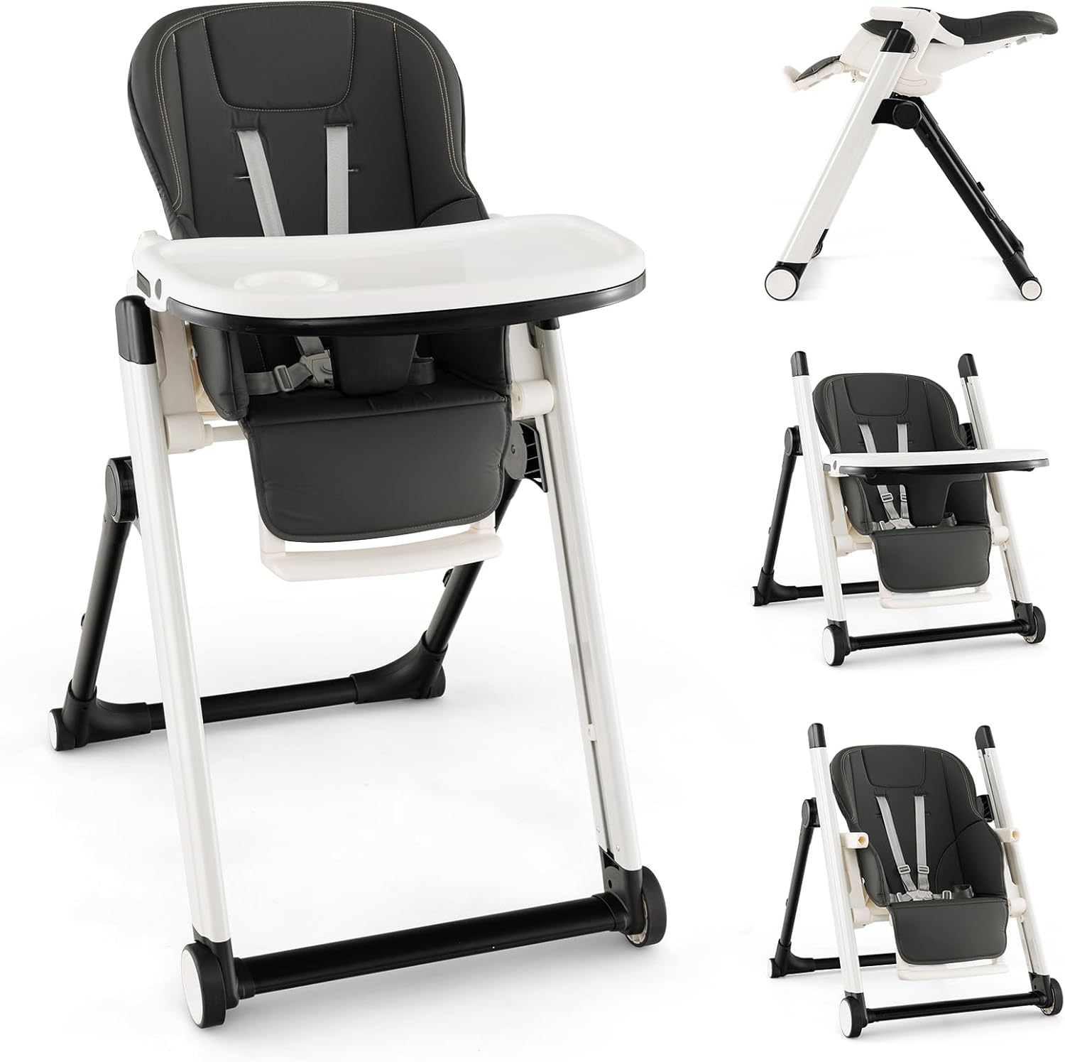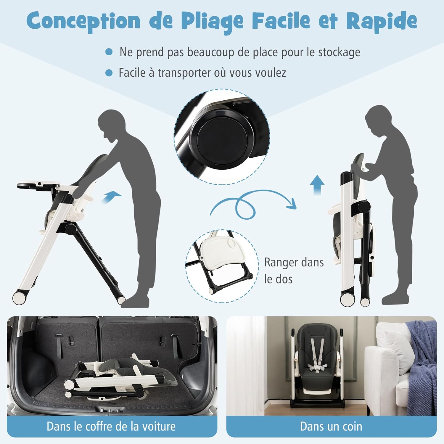 • Facile à Plier et à Transporter : Grâce au bouton de pliage rapide, la chaise haute peut être pliée en quelques secondes et peut être facilement placée dans un coin ou dans le coffre, pour gagner de la place et faciliter le transport. De plus, elle est équipée de 4 roulettes (dont 2 verrouillables) pour un déplacement facile.