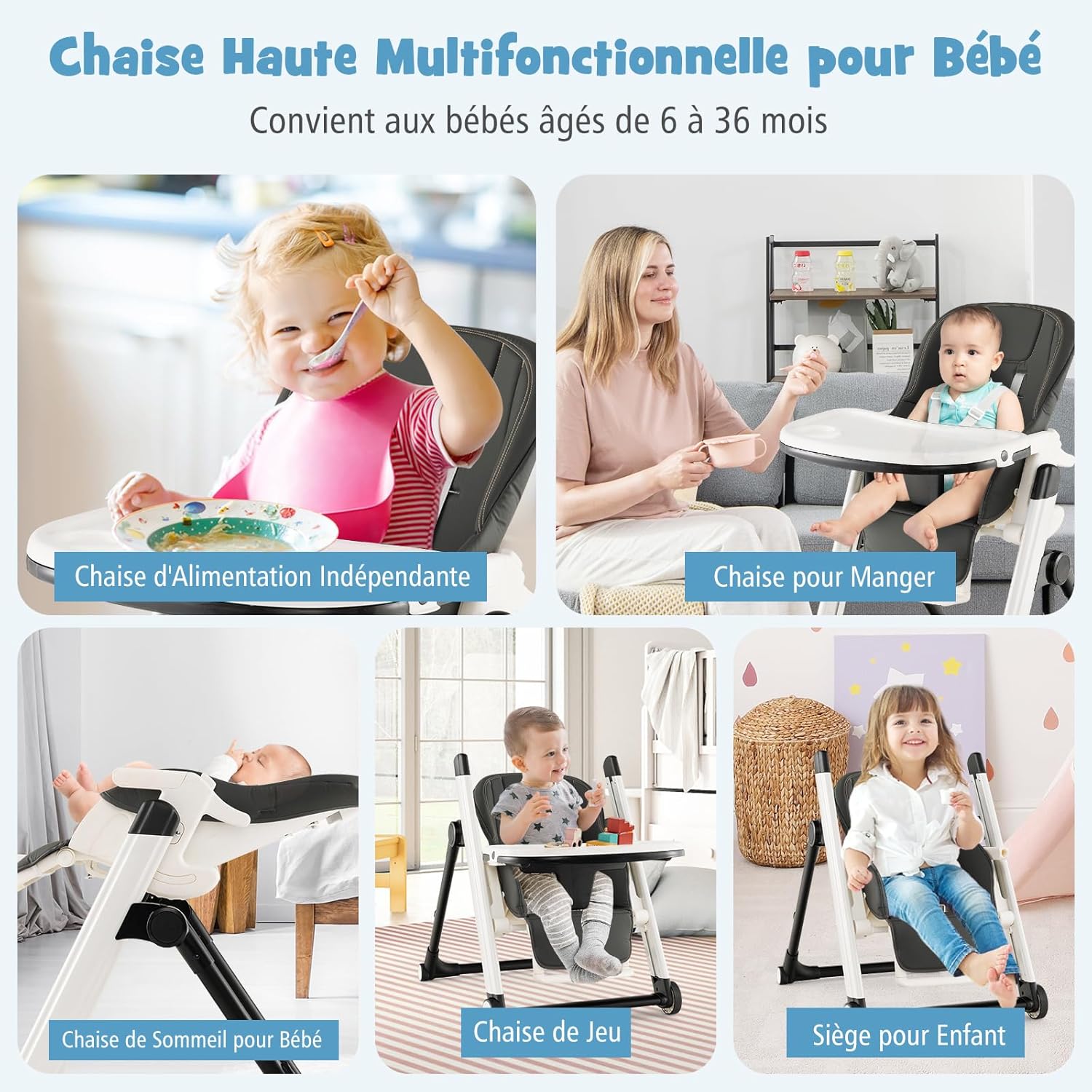 • Chaise Haute Multifonctionnelle : Cette chaise haute peut être utilisée comme chaise de repas autonome, chaise d'alimentation, dormeuse pour bébé, chaise de jeu ou siège pour enfant, convenant aux bébés de 6 à 36 mois, pour répondre aux besoins des bébés à différents stades.