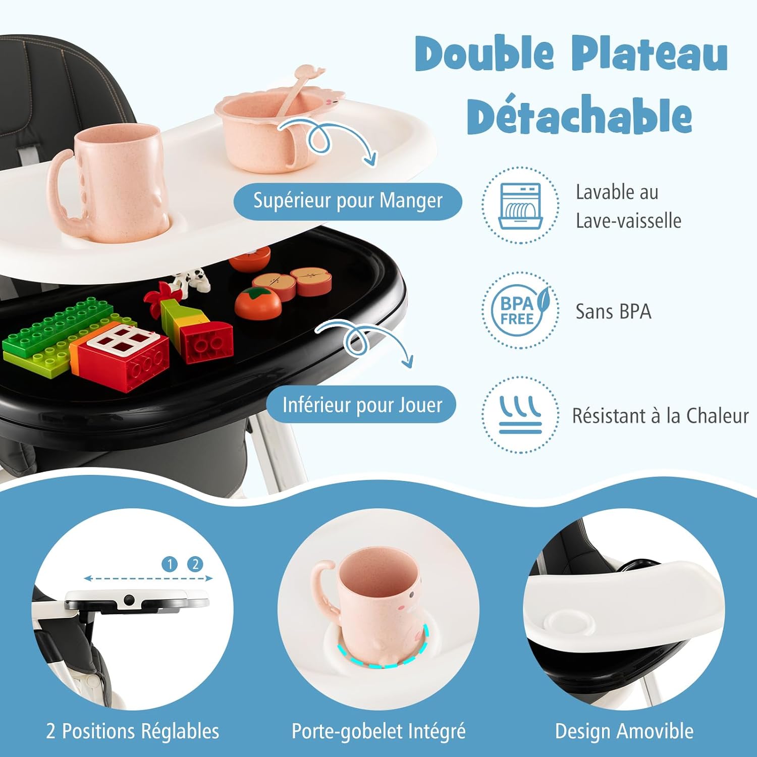 • Double Plateau Amovible : Le plateau supérieur pour manger et le plateau inférieur pour jouer. Le double plateau possède 2 positions réglables et peut être facilement retiré et rangé sur le dossier du siège. De plus, le plateau avec porte-gobelets intégrés peut être lavé au lave-vaisselle.