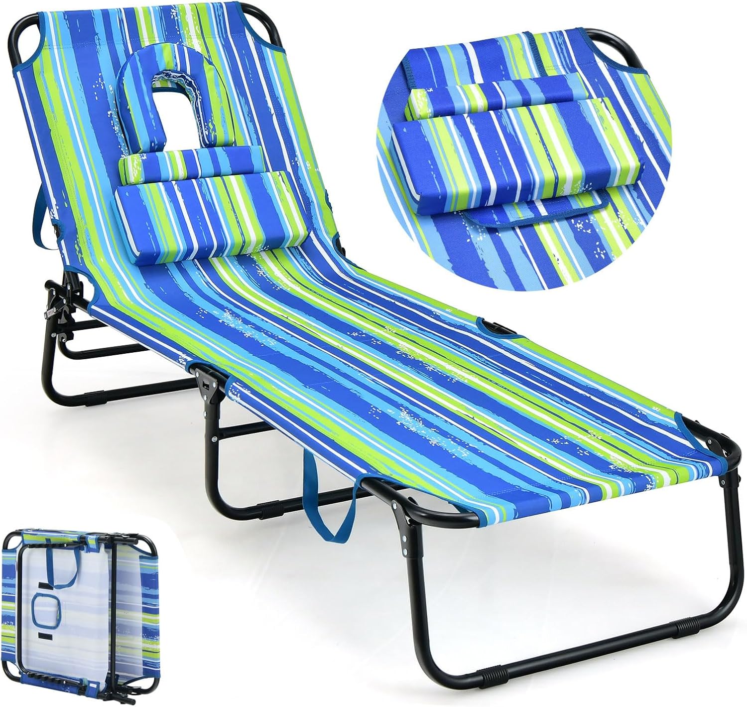 Chaise longue de jardin pliable avec trou pour visage & 3 coussins amovibles, charge 160 kg, bleu+vert