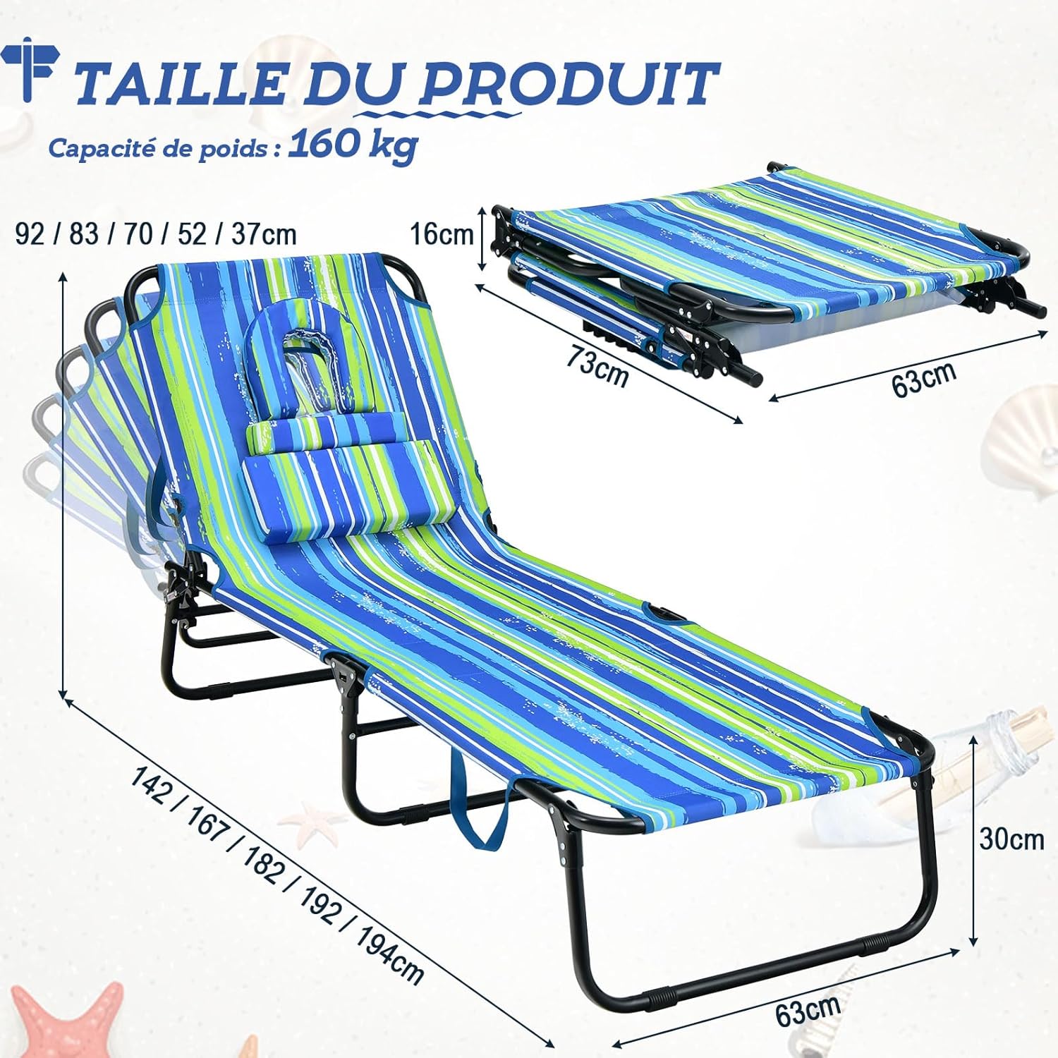 | Libellé | Chaise longue de jardin pliable avec trou pour visage & 3 coussins amovibles, charge 160 kg, bleu+vert |