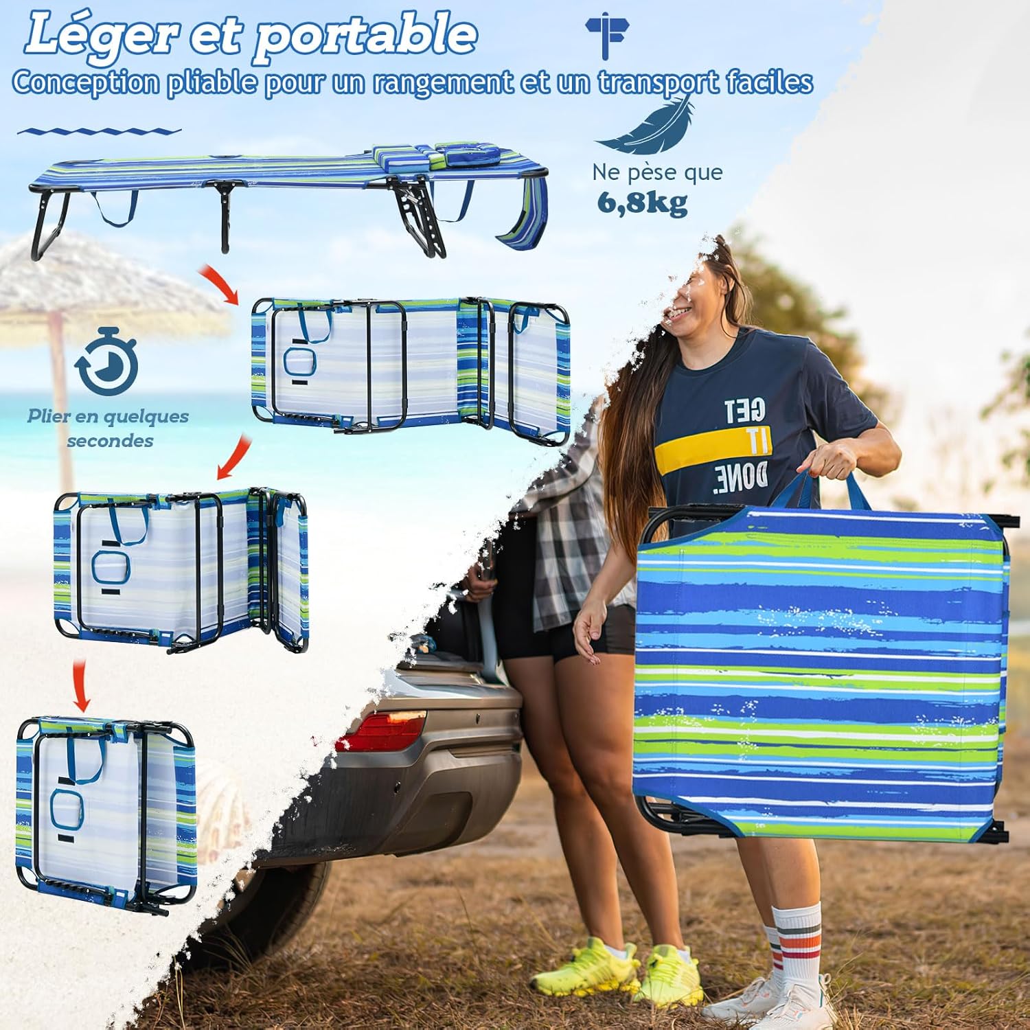 - Design pliable et portable : La chaise longue inclinable peut être facilement pliée à plat, pratique pour le rangement et le transport quotidien en économisant de l’espace. De plus, elle est équipée de sangles de transport pour être rangée contre le mur, sous le canapé ou dans le coffre de voiture.