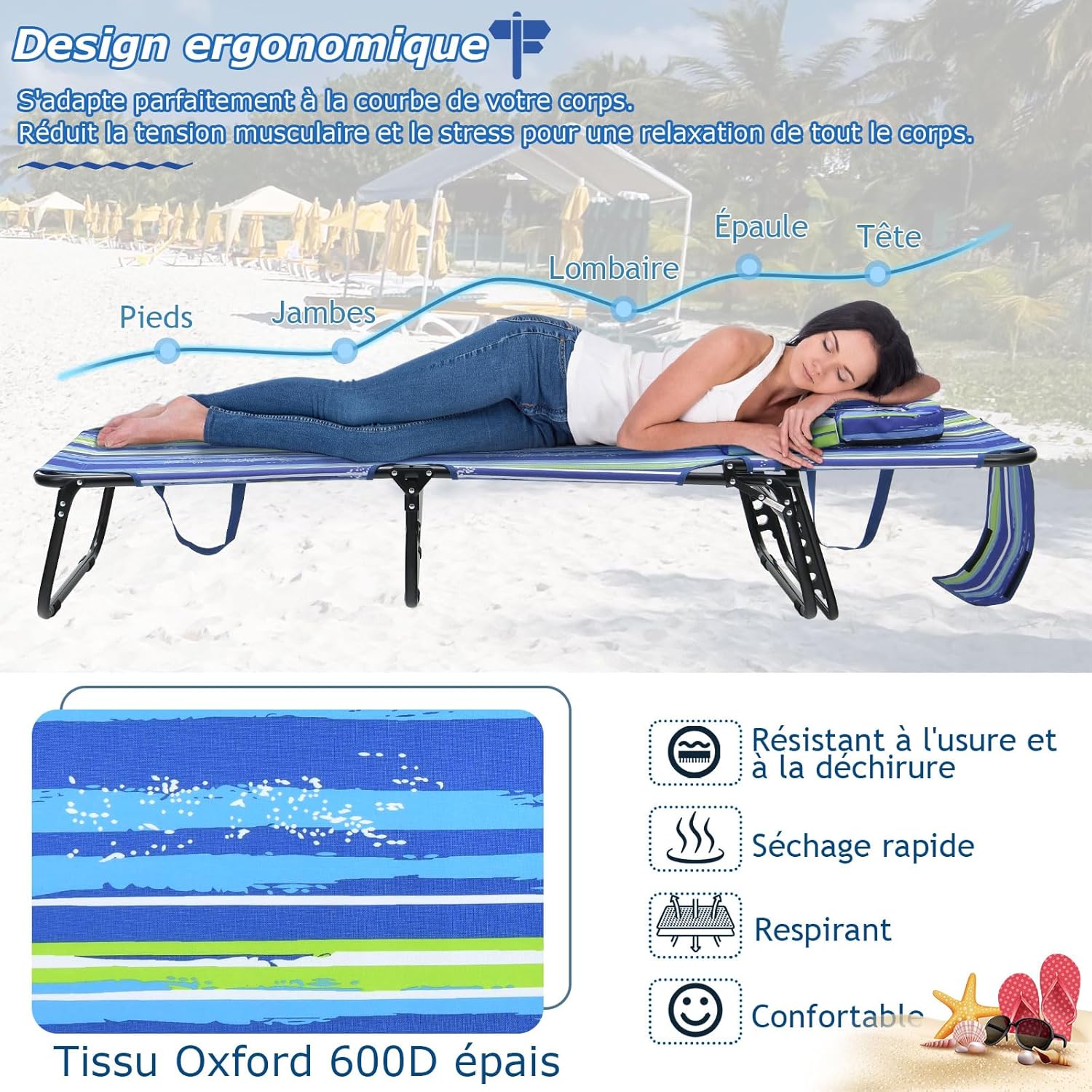 - Construction durable et stable : La chaise longue pliante est dotée d'un tissu Oxford, résistant à l'usure et aux déchirures et à séchage rapide. De plus, le cadre est constitué de tubes métalliques revêtus de poudre, assurant une grande capacité de charge de 160 kg.