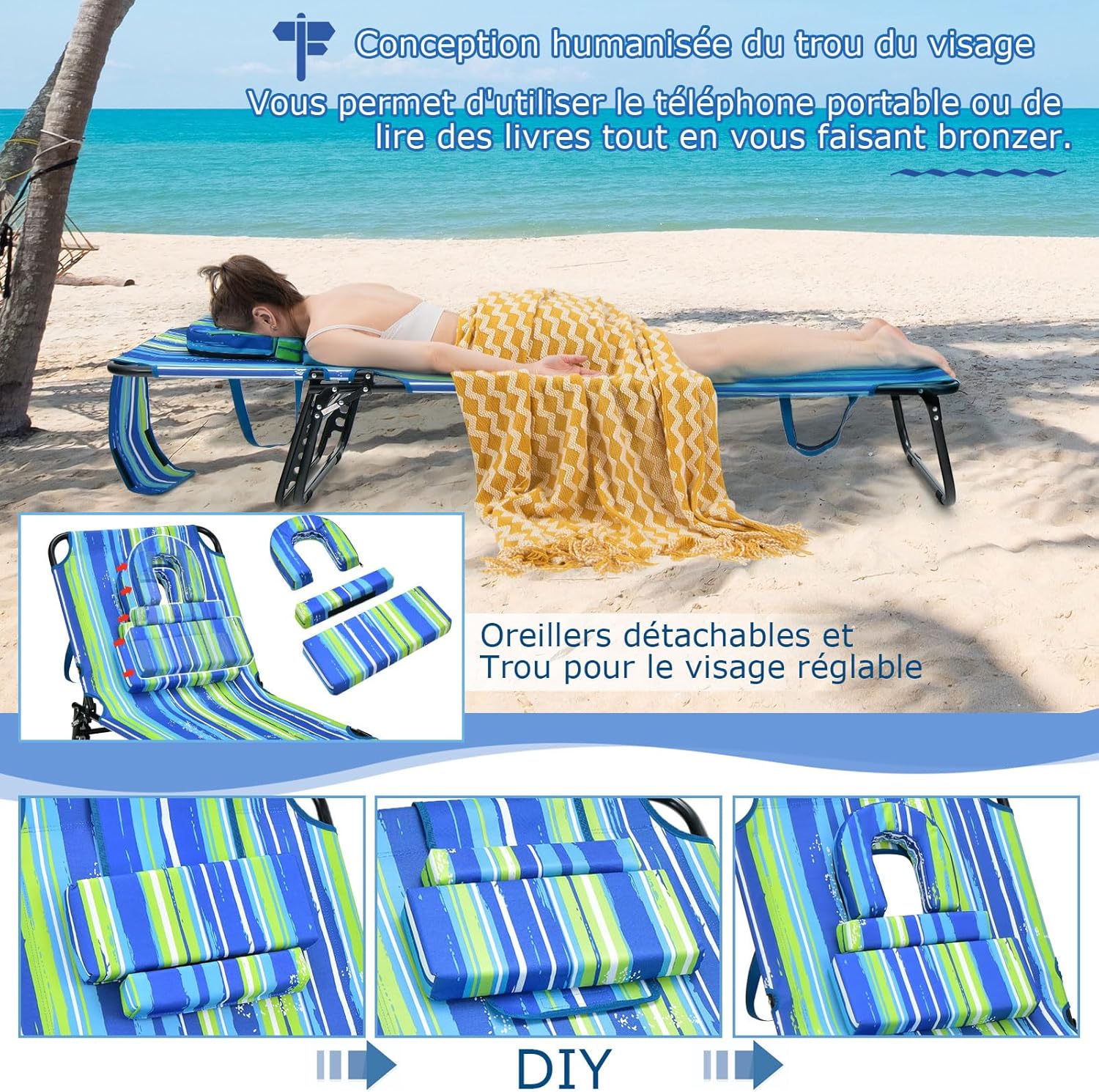 - Conception humanisée : La chaise longue de jardin est équipée d'oreillers détachables et d'un trou pour le visage, vous permettant d'utiliser le téléphone ou de lire en bronzant le dos. De plus, le trou pour le visage peut également être recouvert d'un tissu amovible.