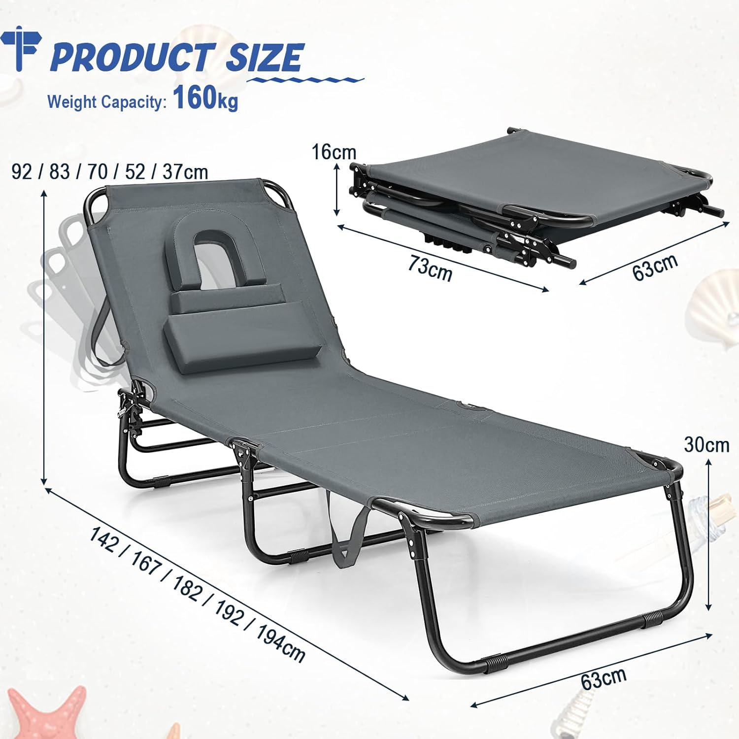 Chaise longue de jardin pliable avec trou pour visage & 3 coussins amovibles, charge 160 kg (gris)