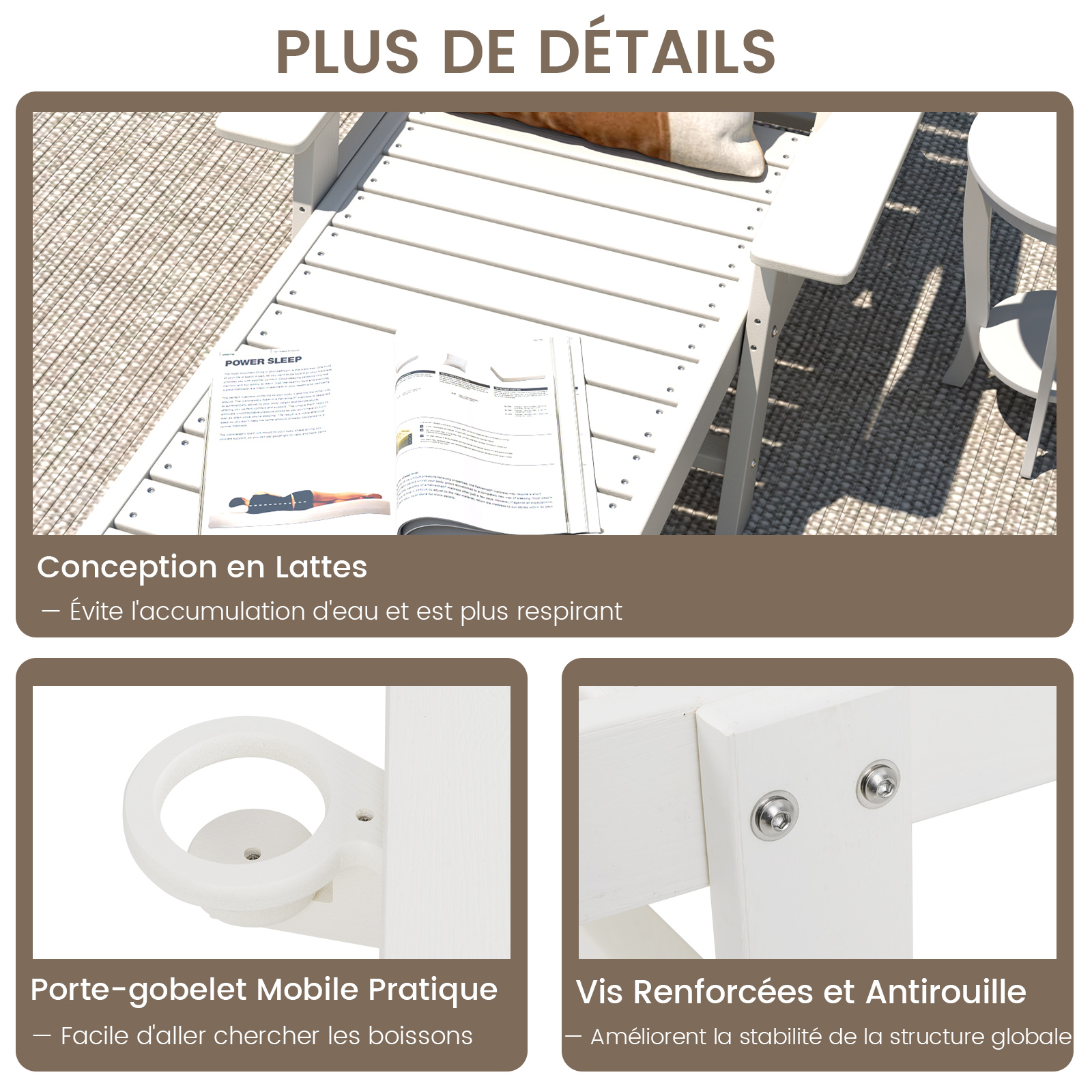 - Matériau HDPE de Qualité Supérieure:Cette chaise longue jardin est fabriquée en HDPE de haute qualité, résistant à la décoloration, à l'eau, au soleil et facile d'entretien. De plus, les vis en acier inoxydable garantissent une structure solide et une longue durée de vie en extérieur.