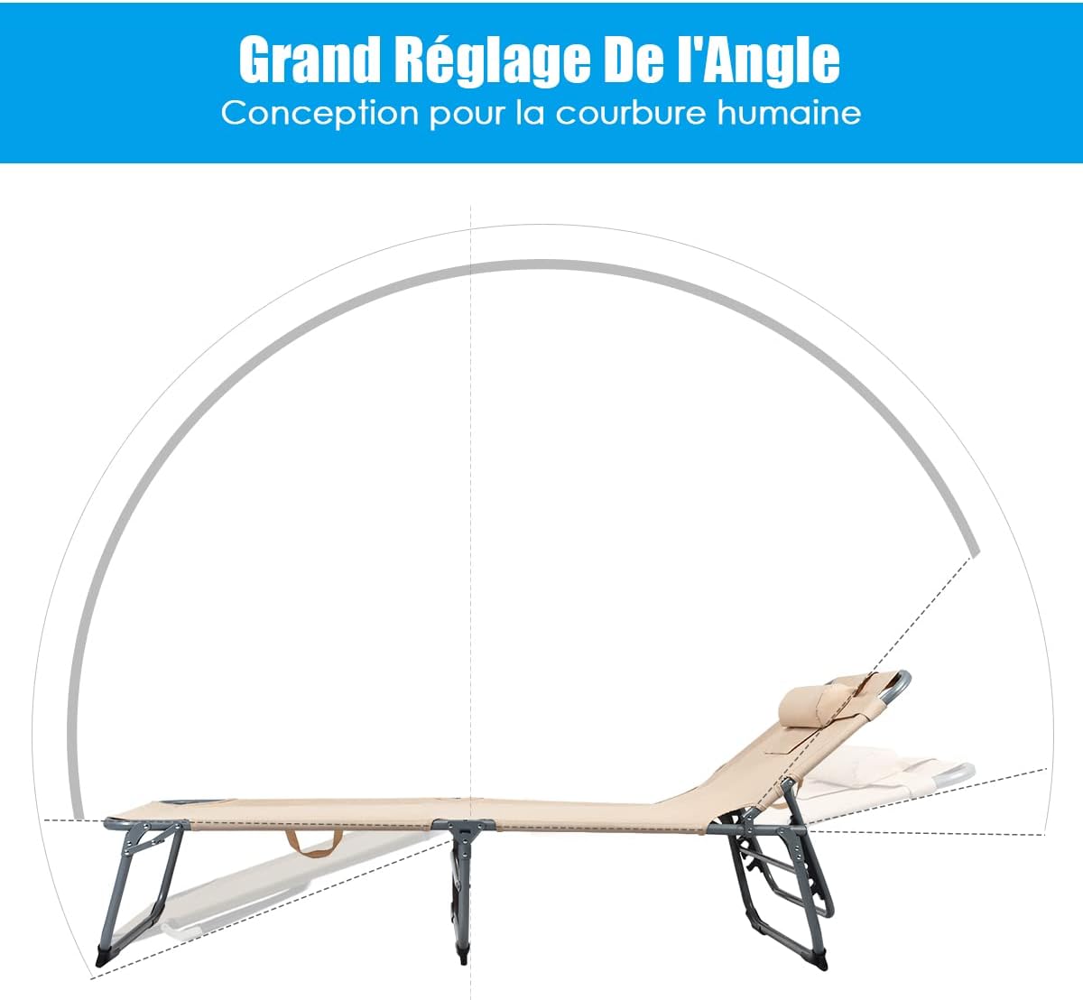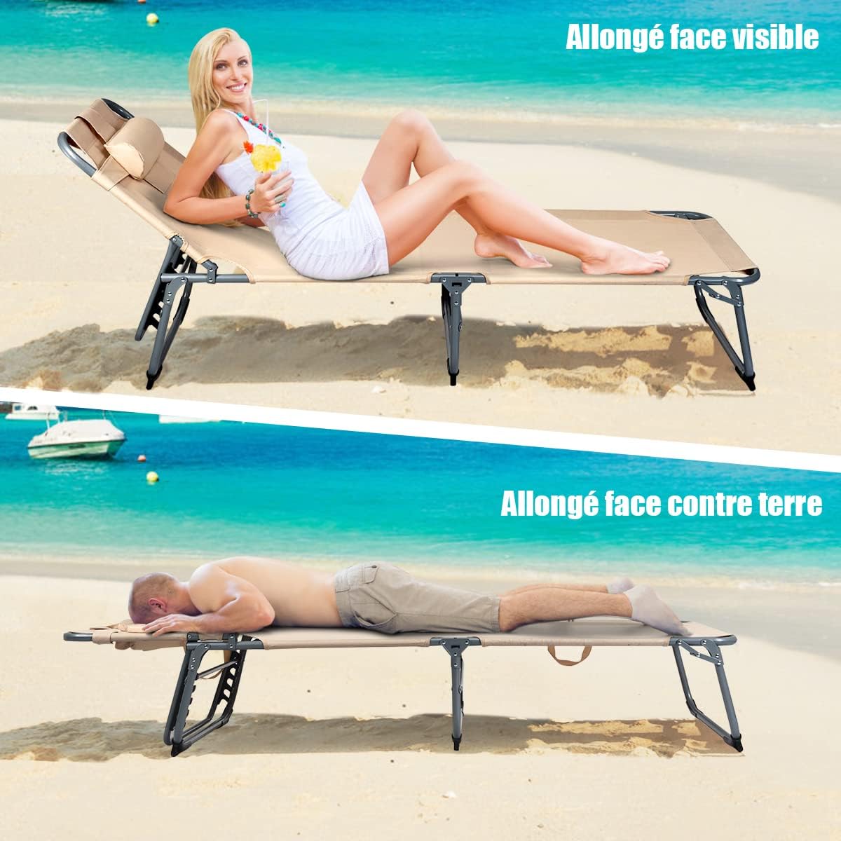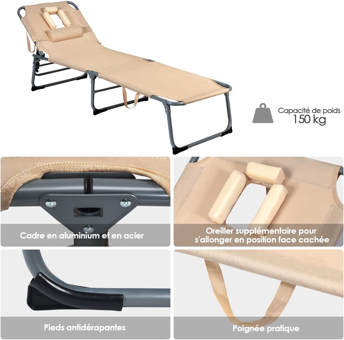 - Design humanisé : Notre chaise longue est équipée d'un oreiller détachable pour servir de repose-tête, de support cervical, de soutien lombaire et d'un trou pour le visage, vous permettant d'utiliser le téléphone ou de lire en bronzant le dos.