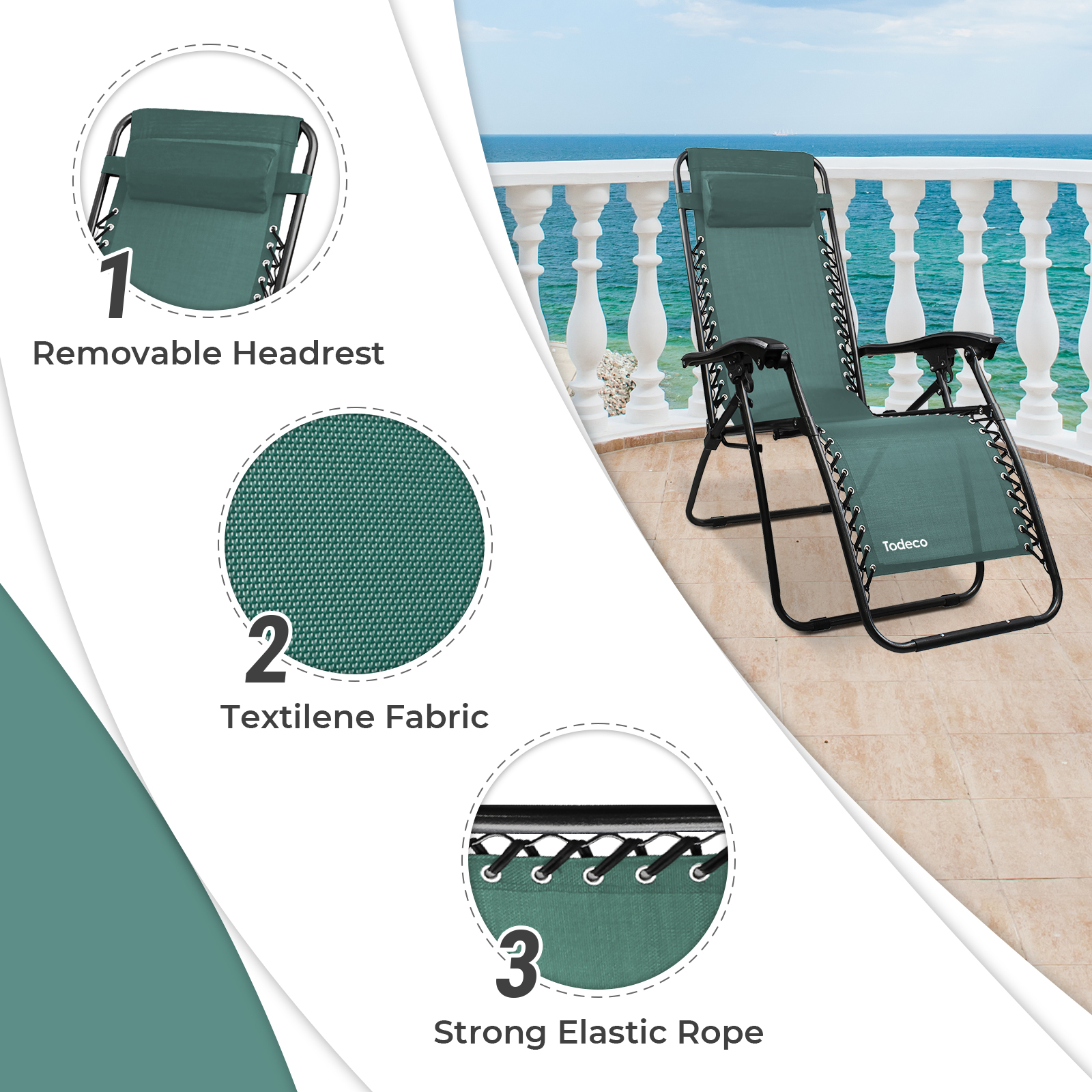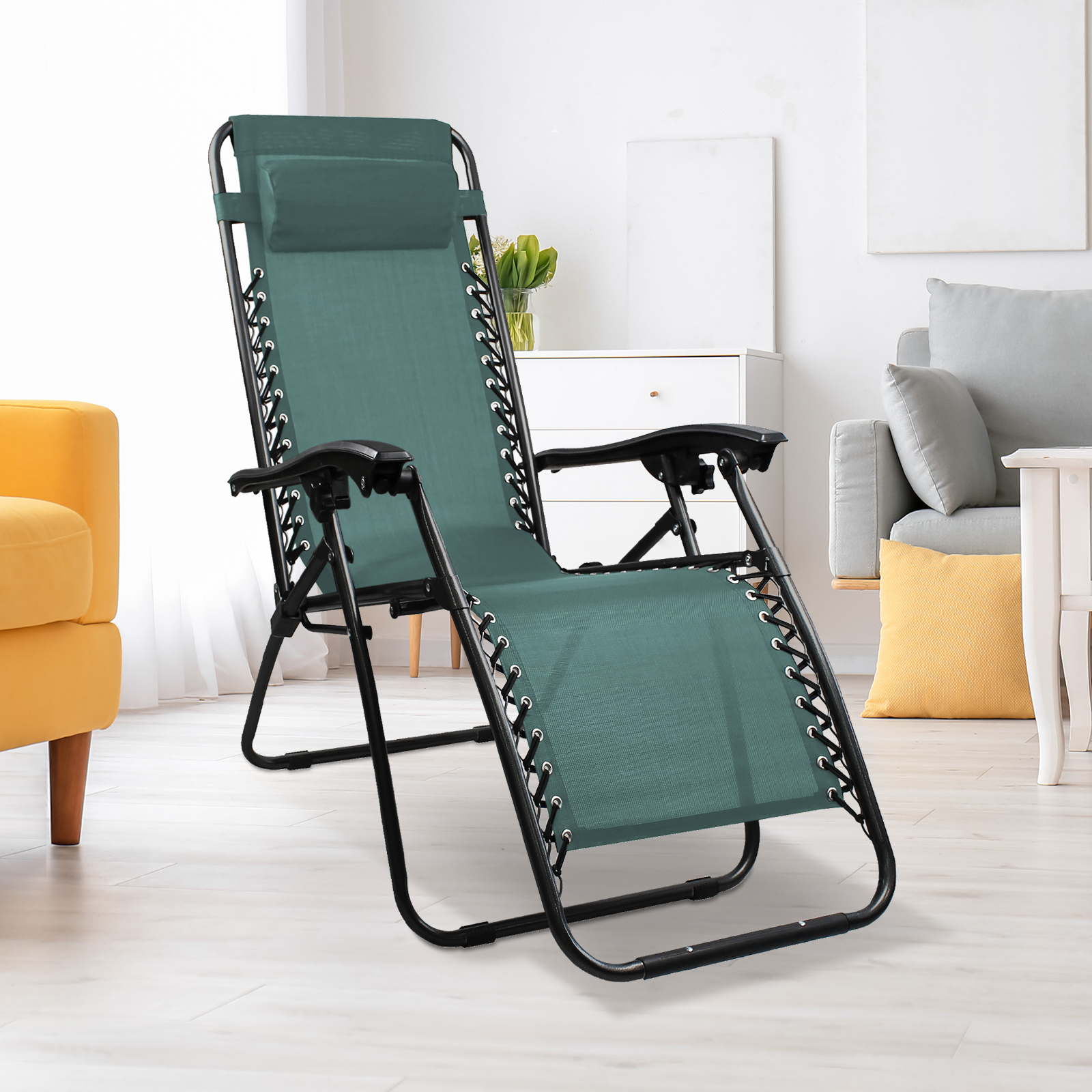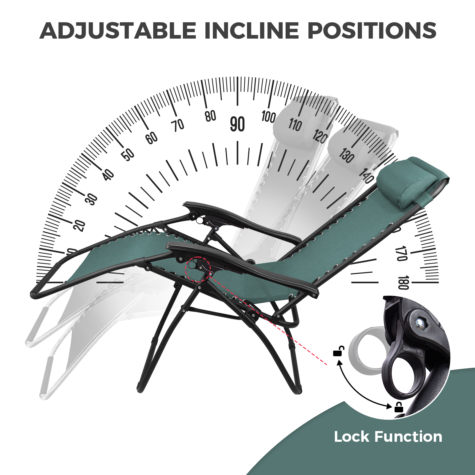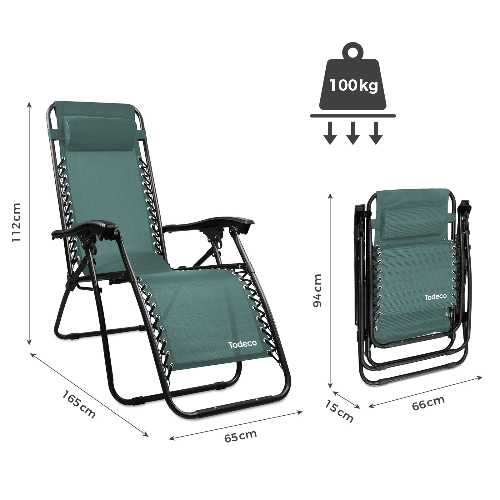 | Libellé | Chaise Longue Inclinable, Transat en Textilène de Jardin, 165 x 112 x 65 cm, Vert, Avec coussin, Textilène, Charge maximale: 100 kg |
