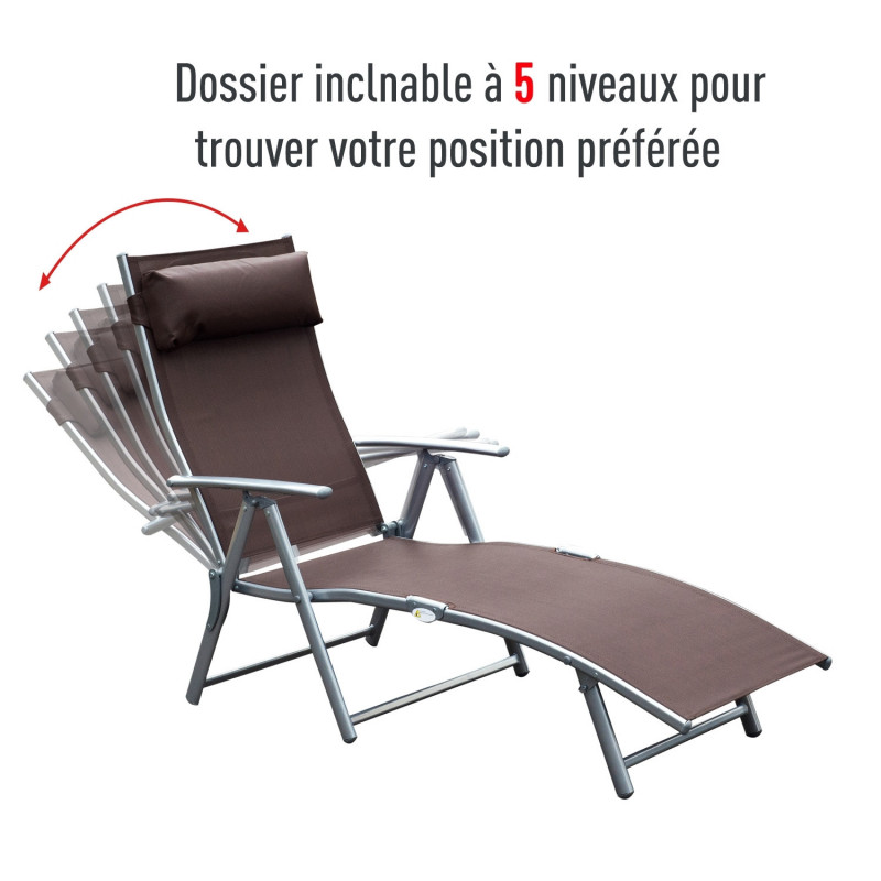 La chaise longue inclinable Bain de Soleil Pliable assure un extraordinaire bain de soleil. Il garantit un meilleur confort permettant de profiter réellement du soleil au jardin. Elle peut être posée sur la terrasse ou même au bord de la piscine pour admirer les merveilles de la nature. Elle est pliable et prend moins de place. Ses dimensions réduites aident à mieux la ranger. Elle possède un dossier inclinable pour de multi-positions. Les accoudoirs et la têtière assurent à tout utilisateur un repos réparateur. Elle ne fait craindre aucun mal de dos après usage. Nul ne peut résister d'ailleurs à une sieste installé confortablement dans ce transat. Elle est en vente à la société Mycocooning. Cette dernière ne cesse de mettre à la disposition de ses clients des meubles de qualité. Une gamme variée de mobiliers de relaxation, de bureau, de jardin, de sport, de fitness et autres est à la portée de tous. Spécifications: - Matériaux principaux : métal époxy anticorrosion et textilène haute densité - Couleurs principale : marron - Dimensions totales position assise : 137L x 64l x 101H cm - Dimensions position semi-allongée : 180L x 64l x 65H cm - Dimensions pliées : 82L x 21l x 65H cm - Dimensions assise : 115L x 54l x 33H cm - Dimensions dossier : 54l x 71H cm - Dimensions têtière : 47L x 18l cm (rembourrage 5 cm) Caractéristiques - Transat avec des accoudoirs couleur grise avec un style contemporain assez élégant - Dossier réglable pour 5 différentes positions au choix - Chaise pliable, facile à transporter et à ranger - Châssis en métal époxy anticorrosion assez robuste garantissant un usage pérenne - Revêtement en textilène pour un meilleur confort - Matière haute densité 560 g/m² résistante aux rayons UV et à l'humidité - Aucun montage nécessaire - Utilisation sans effort