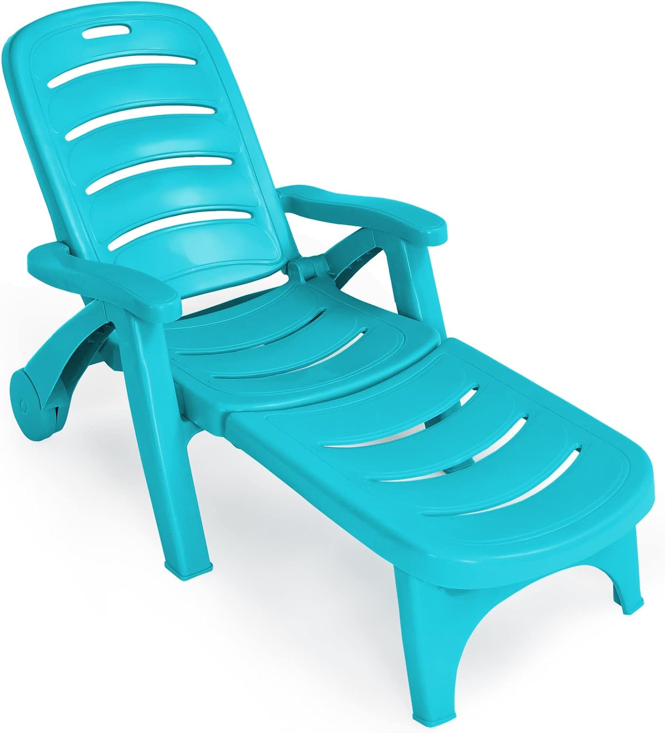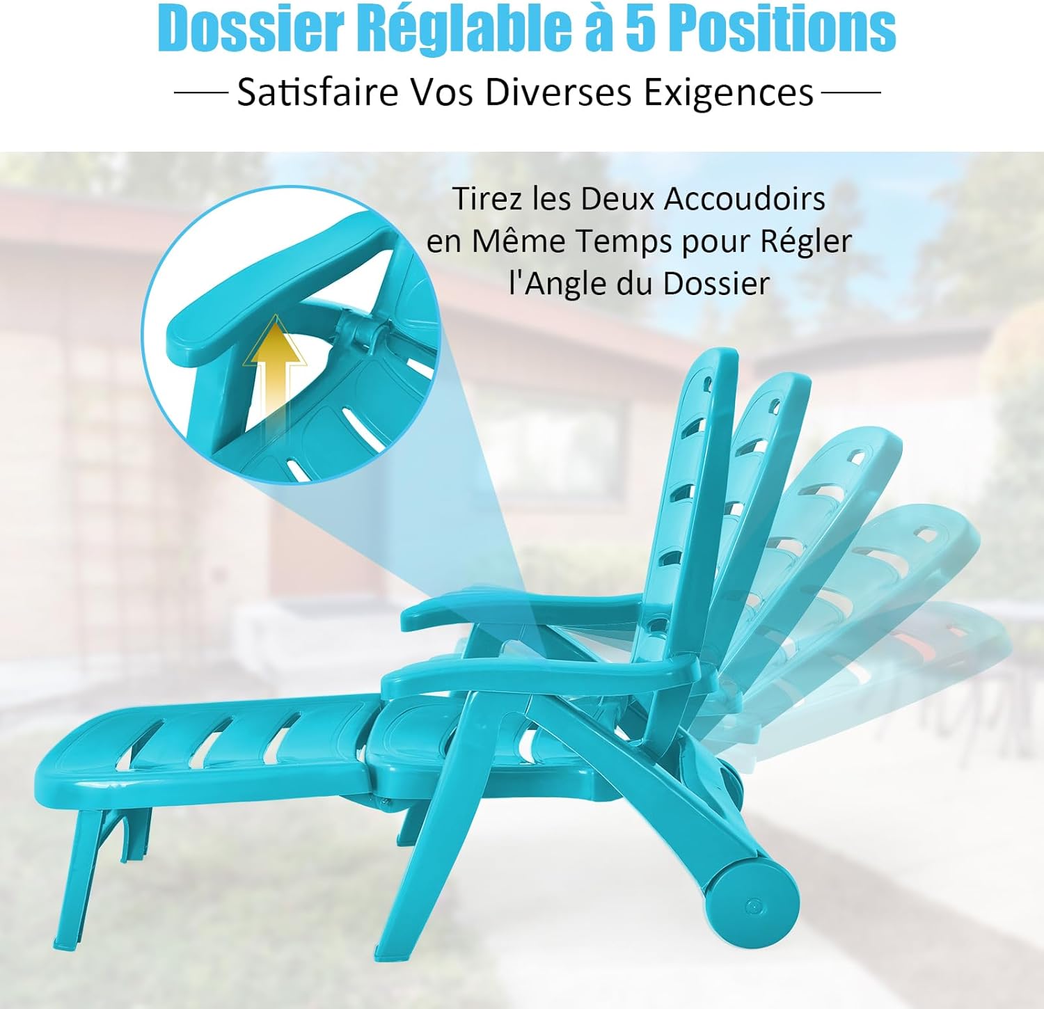 Chaise longue pliante avec dossier réglable à 5 positions, fauteuil de terrasse avec roue intégrée