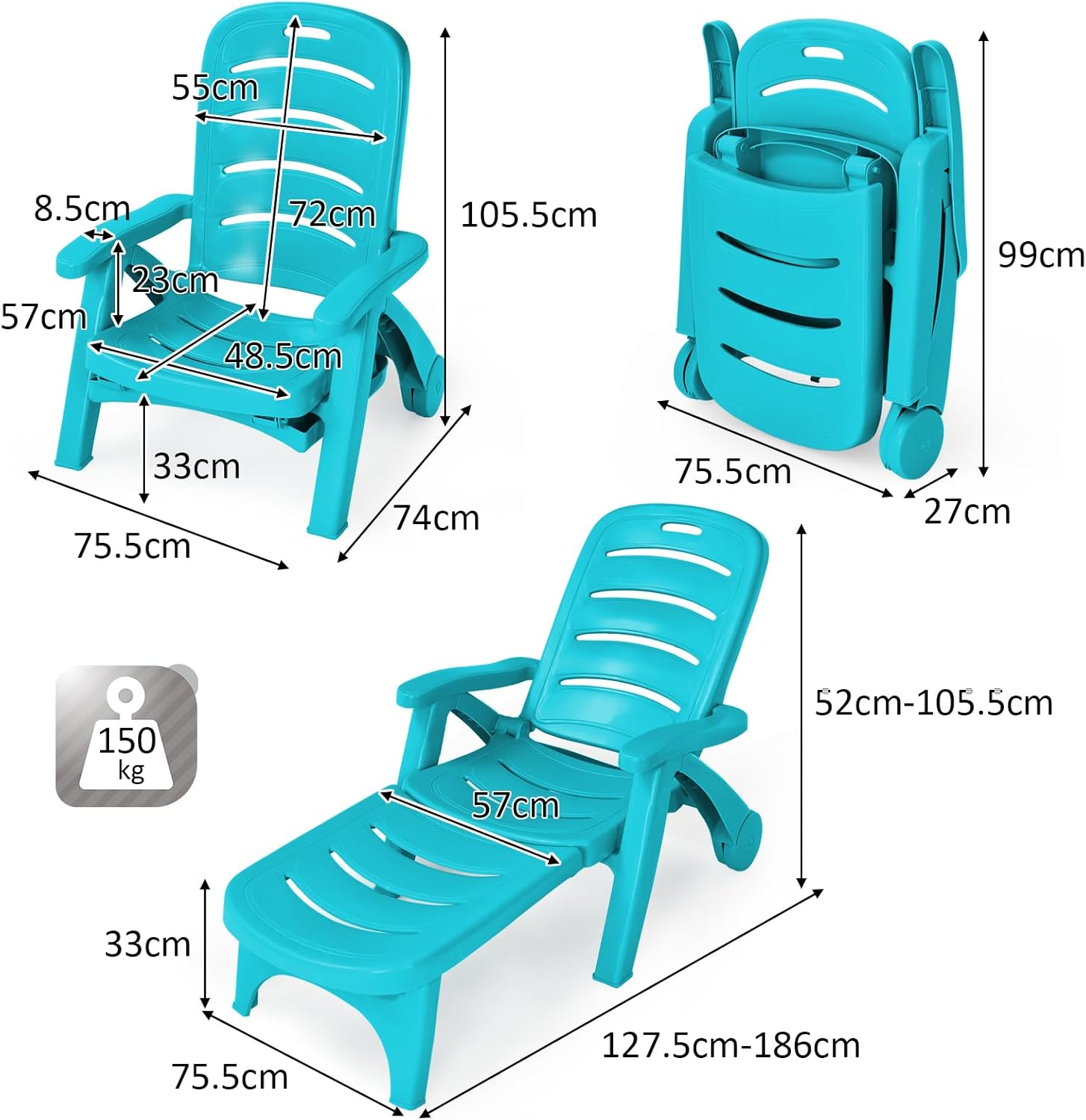 Détendez-vous maintenant et profitez de l'extérieur dans notre confortable chaise longue ! Avec son dossier réglable en 5 positions, elle s'adapte à vos différents besoins, qu'il s'agisse de prendre un bain de soleil, de lire ou de faire une sieste. Fabriquée en PP résistant aux intempéries, cette chaise longue relaxante est dotée de poignées intégrées et de roues flexibles pour faciliter son déplacement vers n'importe quel endroit. De plus, lorsqu'elle n'est pas utilisée, la chaise longue peut être rapidement repliée pour gagner de la place.