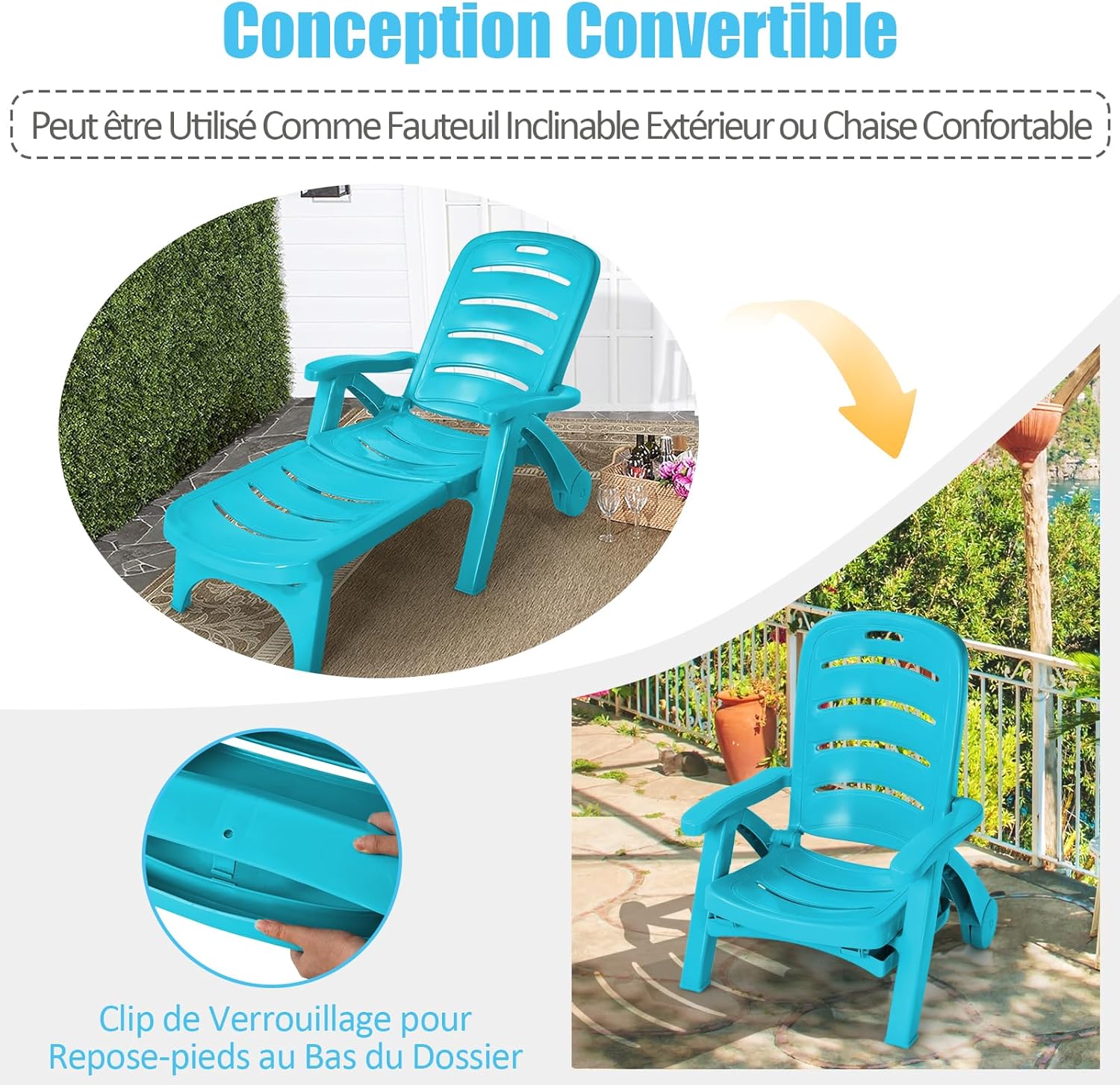 - Chaise longue d'extérieur durable : Fabriquée principalement en PP résistant aux intempéries, cette chaise longue durable offre une excellente résistance à la décoloration et est imperméable pour une utilisation extérieure de longue durée. Grâce à sa structure triangulaire scientifique, elle offre une capacité de charge allant jusqu'à 150 kg.