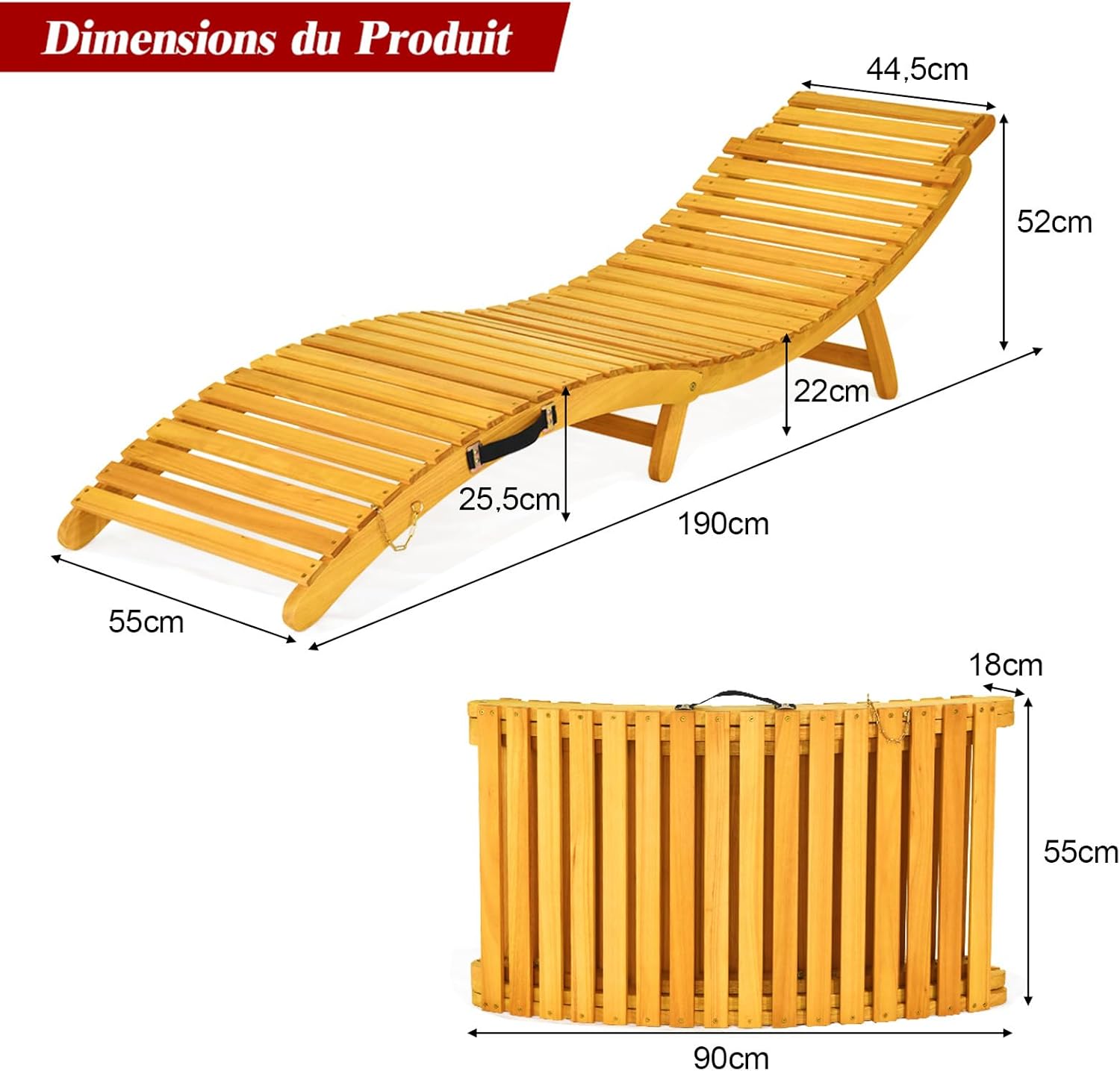 - Fabrication en bois d'acacia massif : Alliant solidité et durabilité, notre chaise longue en bois d'acacia de haute qualité apporte une touche d'élégance naturelle à vos espaces extérieurs tout en garantissant une structure robuste et fiable pour votre détente.