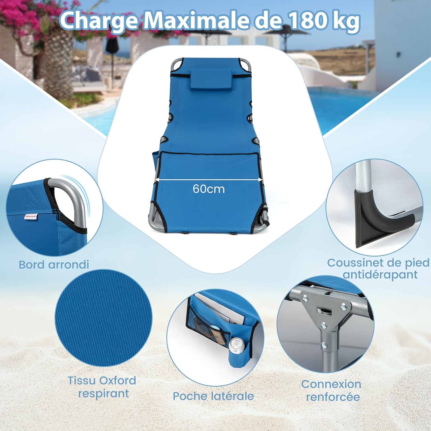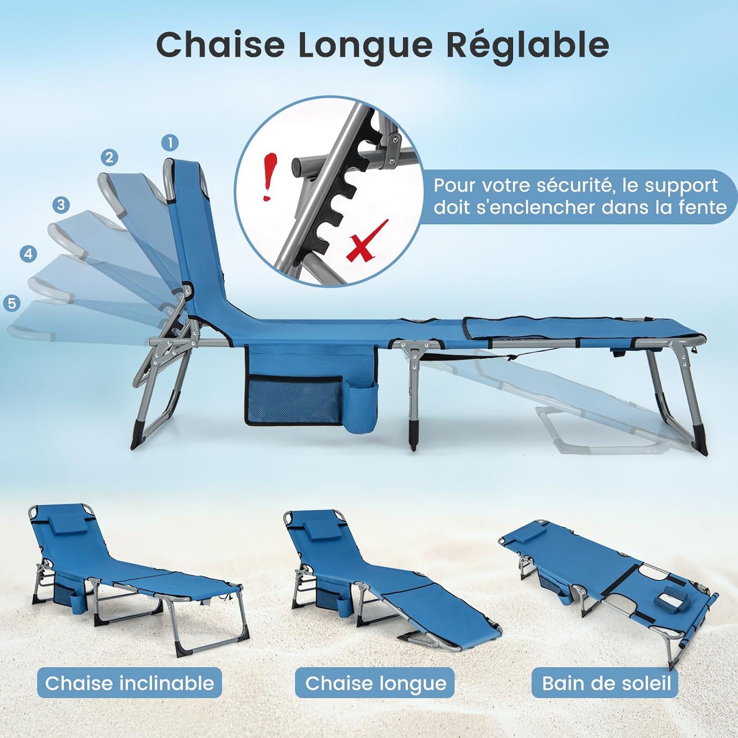 | Libellé | Chaise longue pliante, bain de soleil inclinable avec trou visage et oreiller, 5 positions dossier |