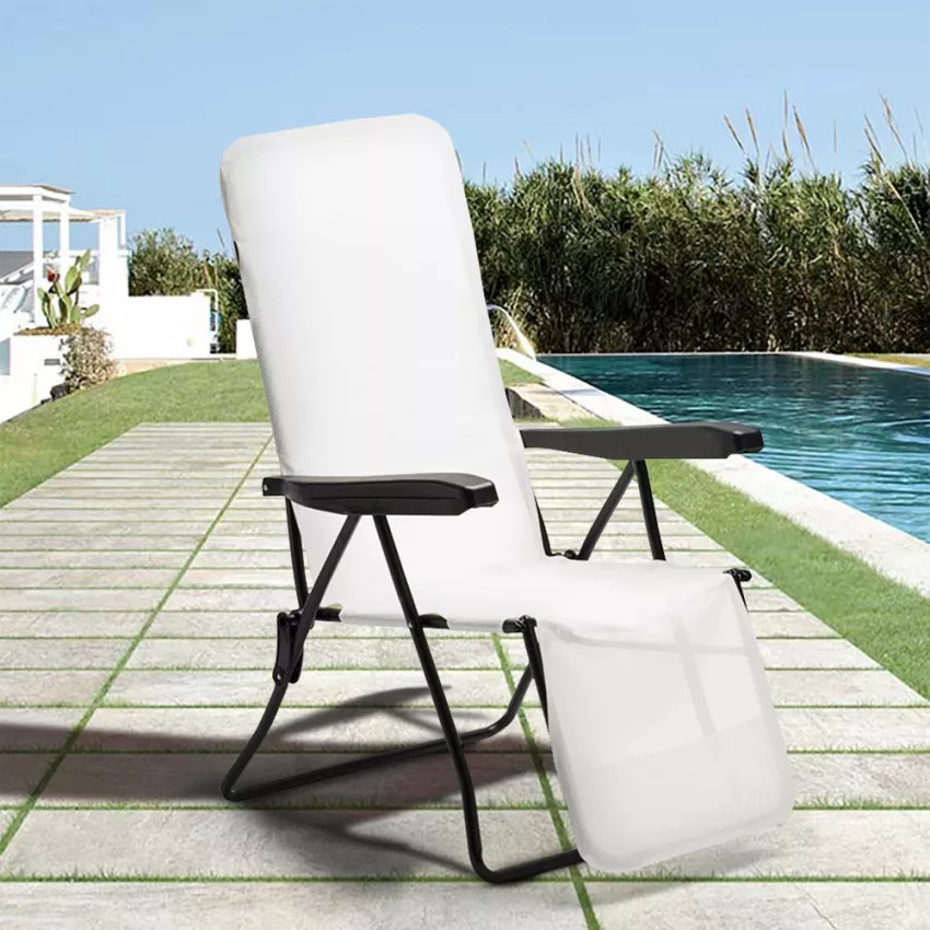 Chaise longue de plage et de jardin pliable avec accoudoirs en acier.