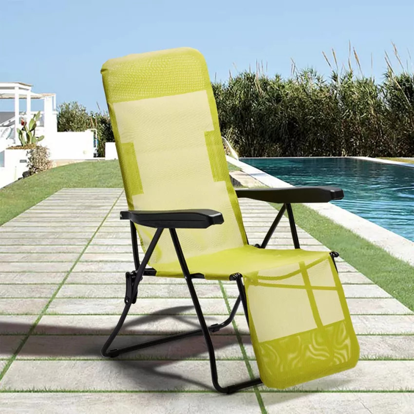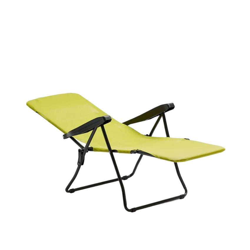 Chaise longue de plage et de jardin pliable avec accoudoirs en acier.