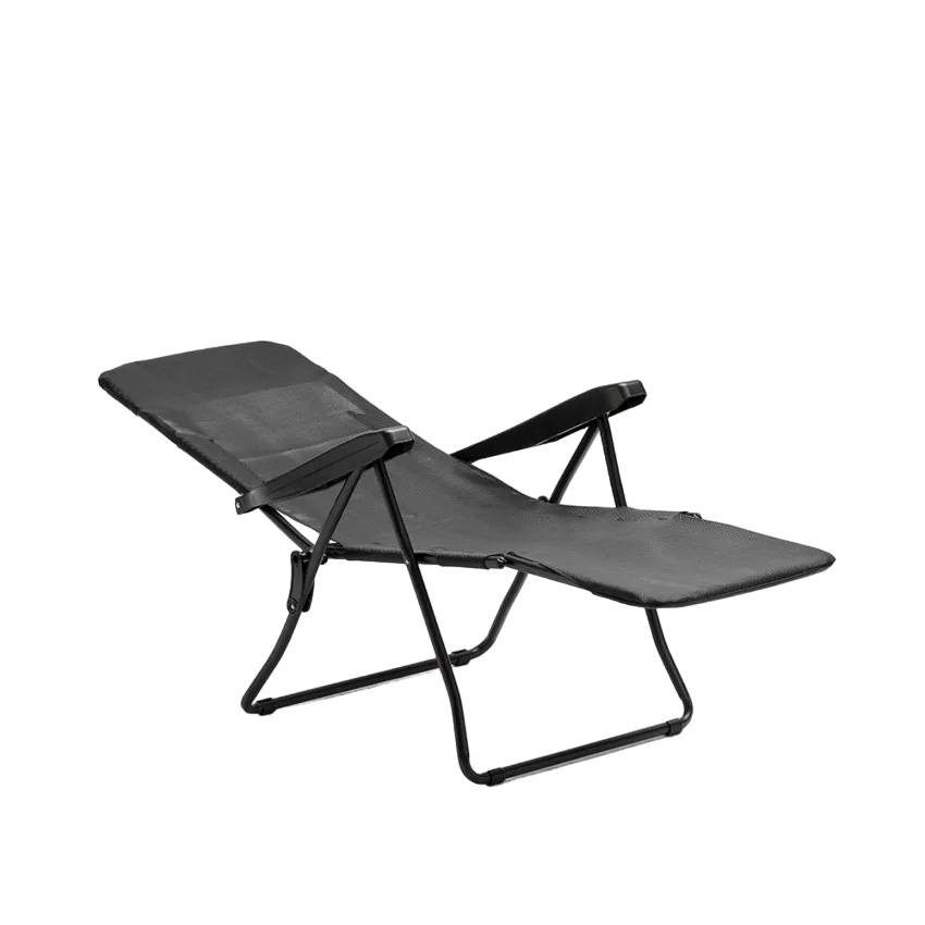 Chaise longue de plage et de jardin pliable avec accoudoirs en acier.