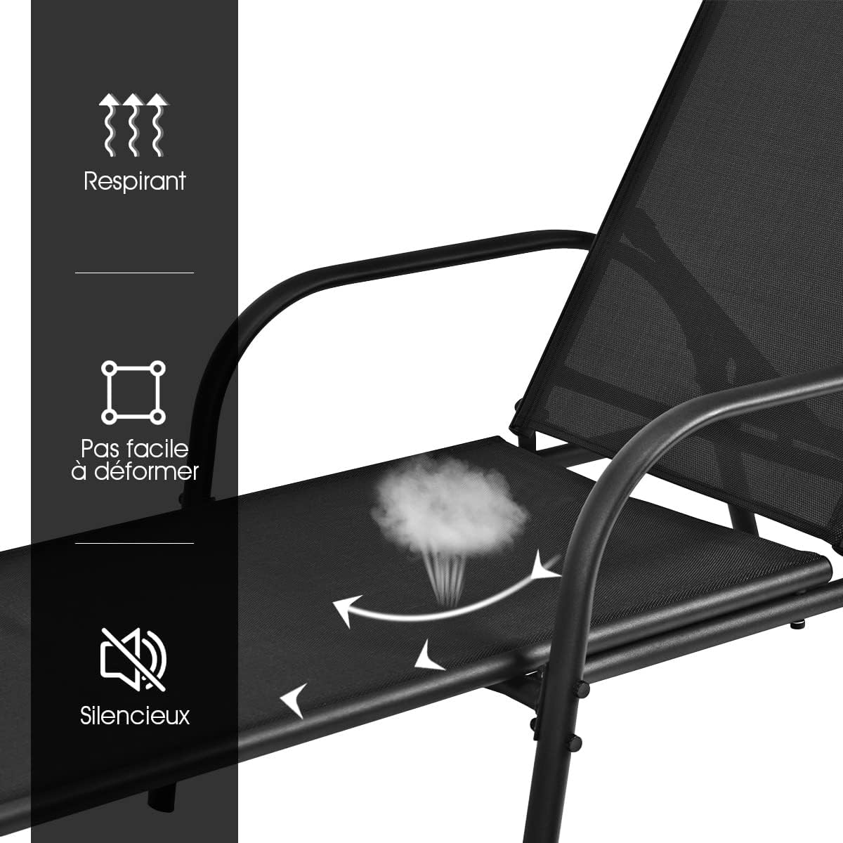 - Chaise confortable : Le tissu textilène respirant confère à notre chaise longue jardin une bon support, qui est ergonomique pour votre colonne vertébrale, l'accoudoir large est aussi confortable pour détendre vos bras.