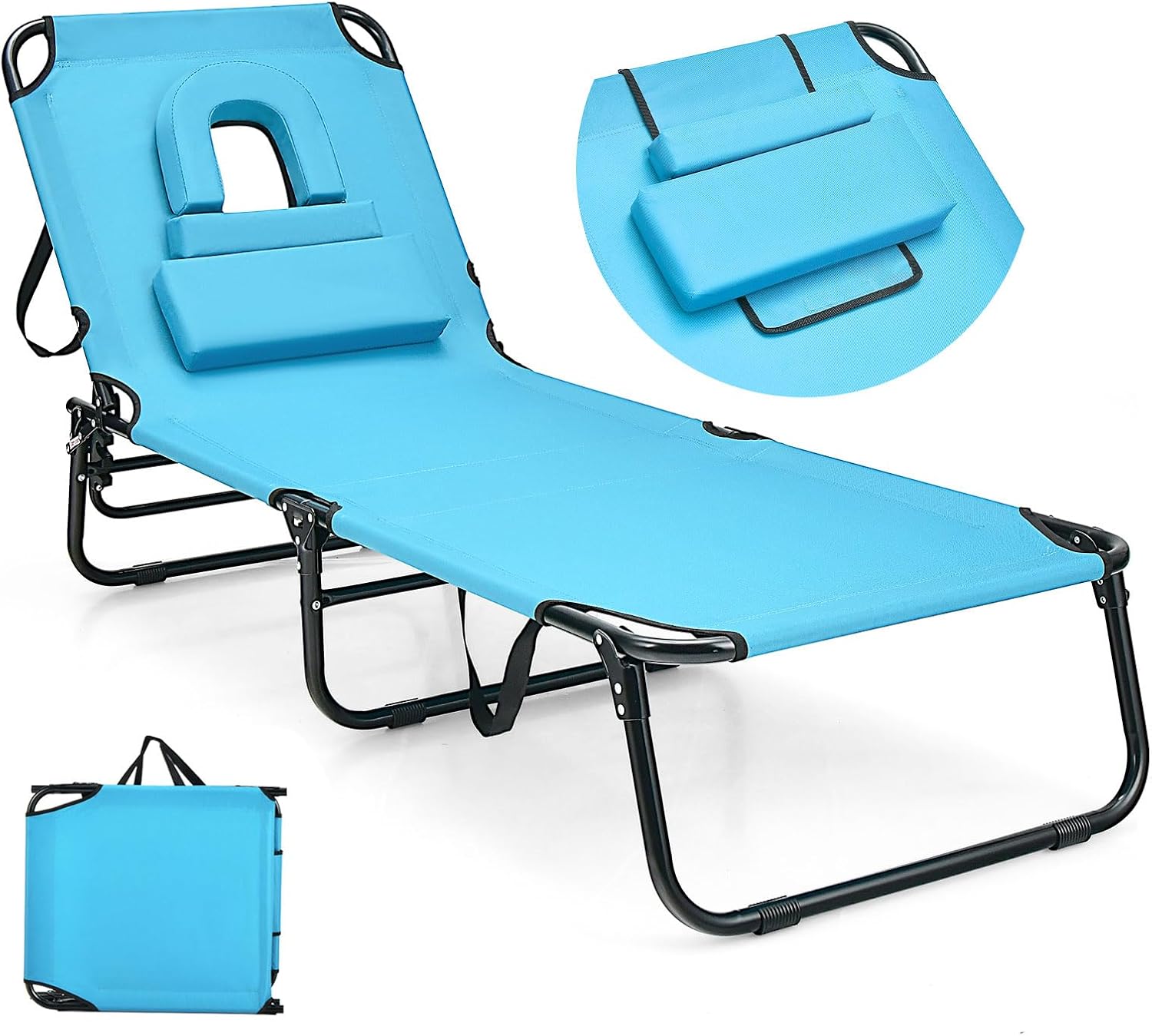 - Design humanisé : Notre chaise longue est équipée d'oreillers détachables et d'un trou pour le visage, vous permettant d'utiliser le téléphone ou de lire en bronzant le dos. Le design ergonomique vous donne une relaxion complète du corps.