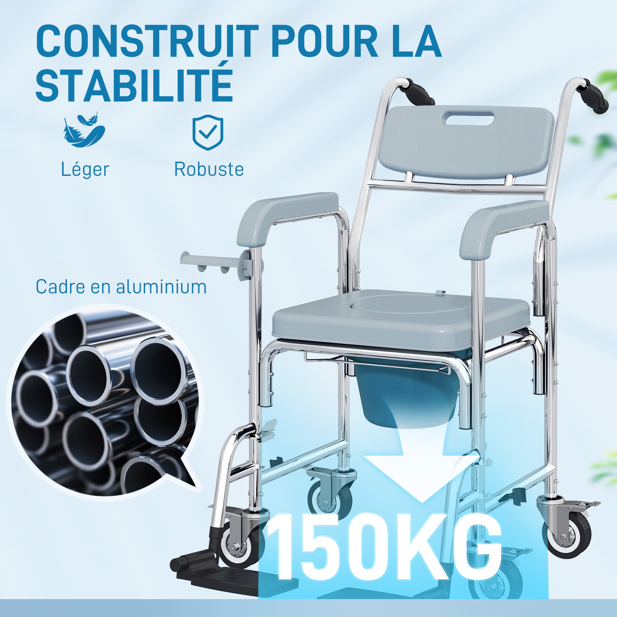| Libellé | Chaise percée médicale à roulettes - repose-pieds, dossier, accoudoirs, pot amovible, support papier - alu blanc HDPE gris |