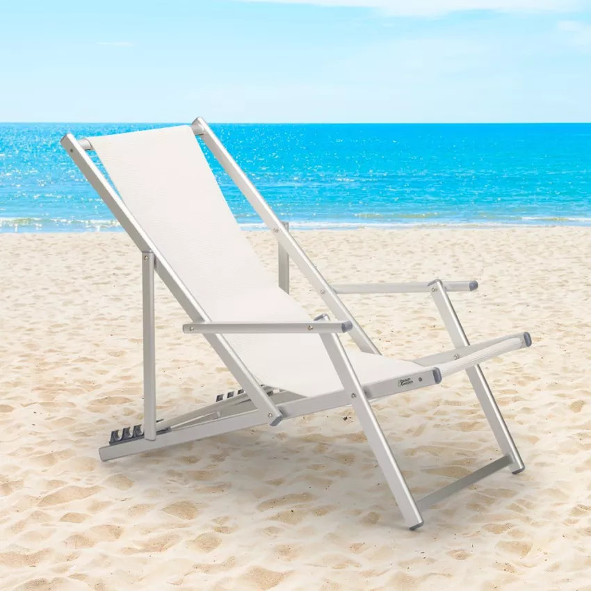 Installez-vous confortablement dans la chaise longue pliante avec accoudoirs, mais n'oubliez pas votre crème solaire pour profiter en toute tranquillité du repos qu'elle vous offre.