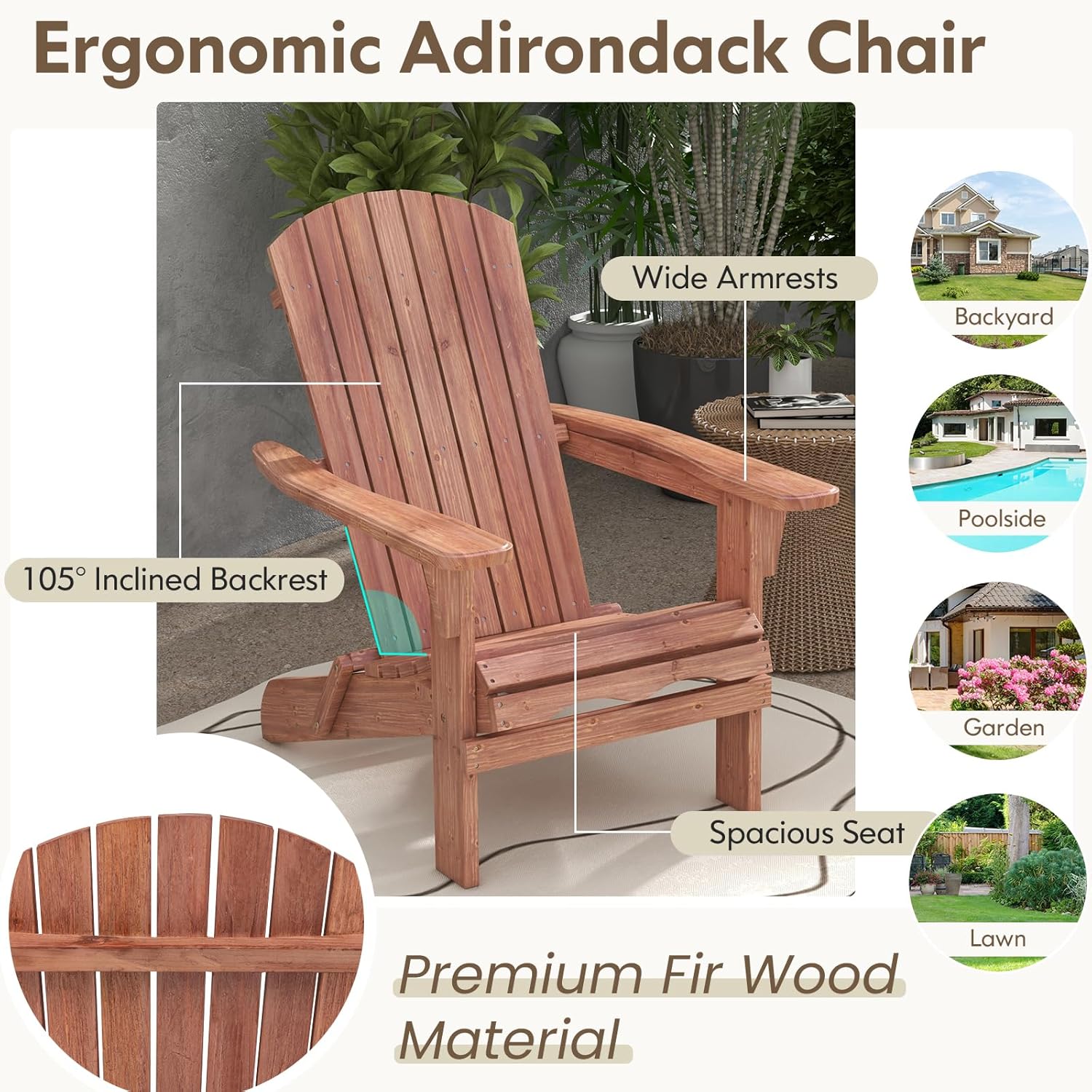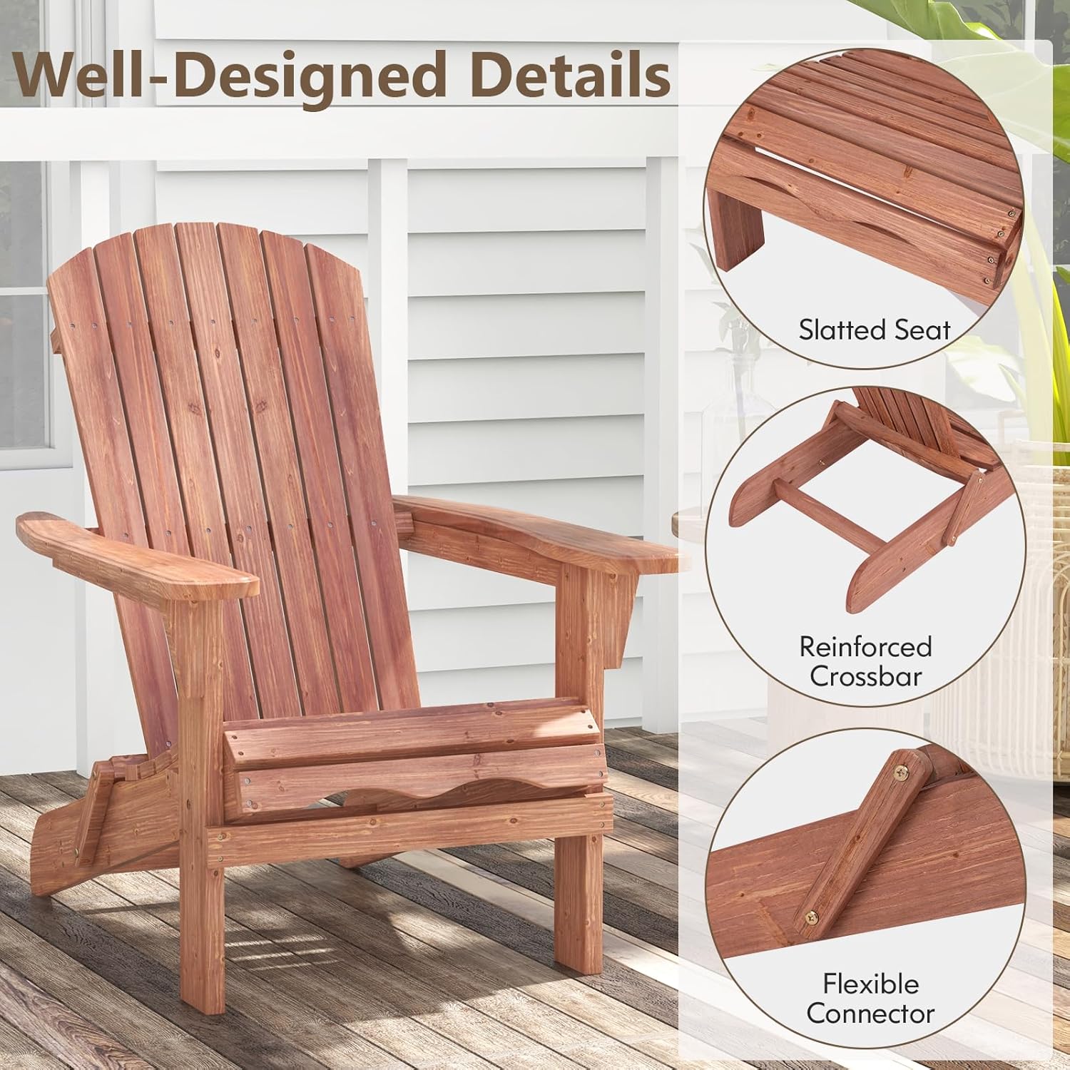 - Élégance intemporelle : avec un design raffiné et des lignes épurées, ce fauteuil de jardin en bois Adirondack s'adapte parfaitement à n'importe quel environnement extérieur. Laissez-vous séduire par son charme intemporel, qui s'adapte aussi bien aux milieux traditionnels que modernes.