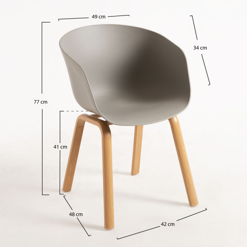 Cette sublime chaise en polypropylène gris de style scandinave avec des pieds en bois couleur naturel est un mélange de simplicité et combiné à des courbes douces. Grâce à ses accoudoirs, vous pouvez offrir le confort supplémentaire dont vos espaces ont besoin. Elle est dotée de goujons noirs anti-dérapants et anti-rayures. Ce fauteuil est idéal pour les chambres à coucher, les salles à manger, les bureaux .... Hauteur totale: 77 cm. Profondeur d assise: 41 cm. Largeur d'assise: 51 cm. Hauteur à l'assise: 41 cm. Largeur du dossier: 49 cm. Hauteur du dossier: 34 cm. Hauteur des jambes: 41 cm. Largeur des jambes: 42 cm. Profondeur des jambes: 48 cm. Poids: 5 kg. Matière d assise: Polypropylène. Matière structure: Acier renforcé. Lieu: Intérieur. Utilisation: Professionnelle et domestique. Style: Nordique. Poids qu il supporte: Jusqu à 120 kilos . Empilable: Non. Nécessite un assemblage: Oui. Fabriqué selon les normes de sécurité en vigueur: EN 581:2017. Garantie: 2 ans.