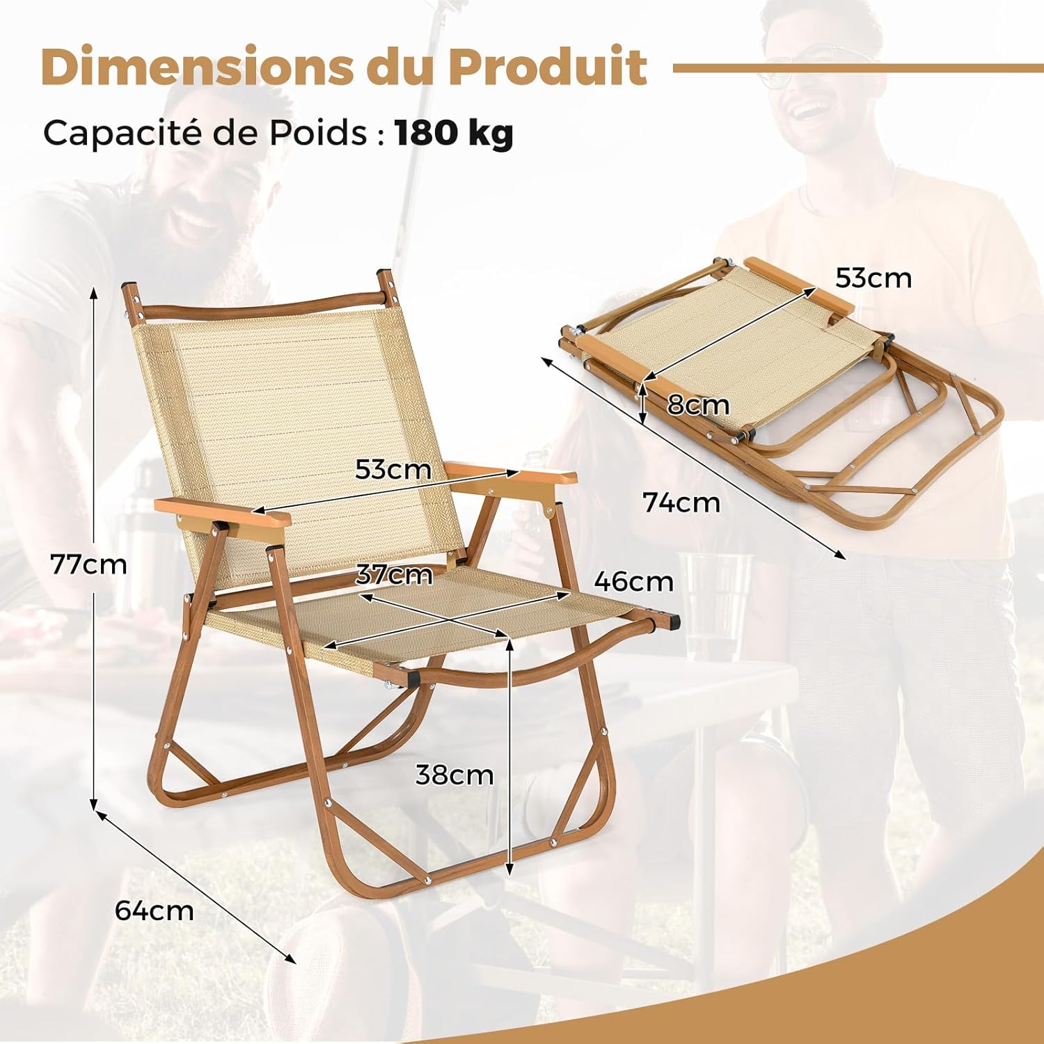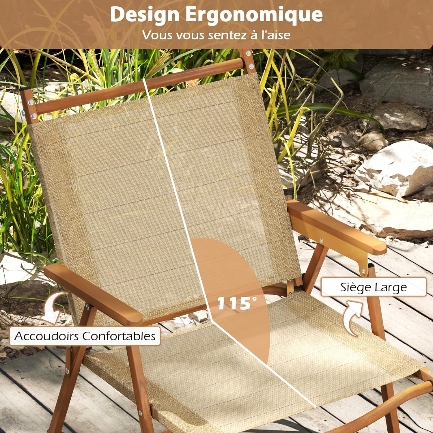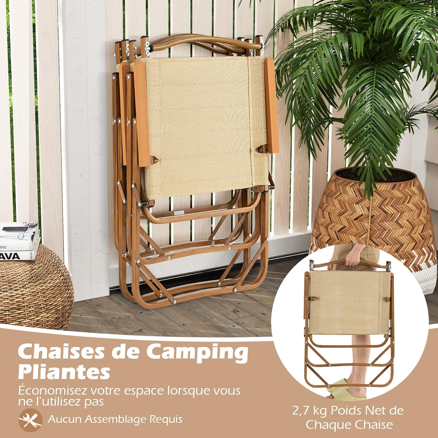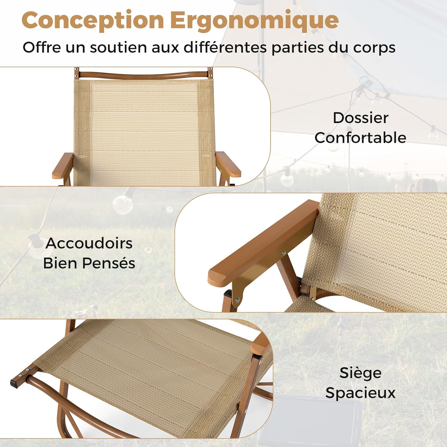 - Polyvalence Extérieure: Vous pourrez vous détendre partout, du jardin à une fête au bord de la mer. Ces chaises portables sont idéales pour les pique-niques, le camping, la pêche ou tout simplement pour profiter de l’air frais en extérieur. Elles ajoutent une touche de style, parfaites pour apprécier le plein air.