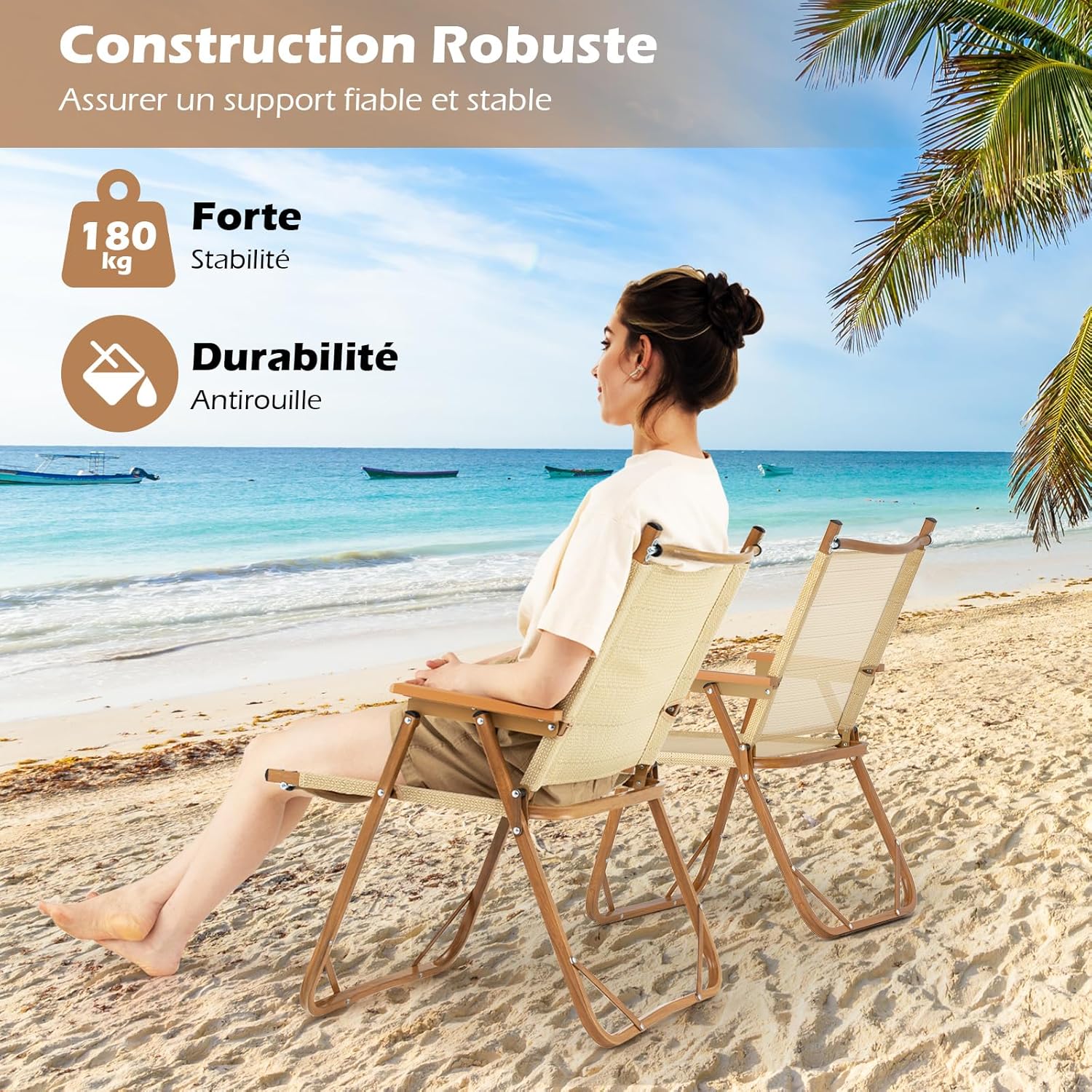 - Structure Robuste en Aluminium: Conçues avec un cadre en aluminium léger mais résistant et une structure triangulaire, ces chaises sont conçues pour durer dans le temps. Elles peuvent facilement supporter jusqu’à 180 kg et combinent résistance et facilité d’utilisation, les rendant parfaites pour tous les membres de la famille.