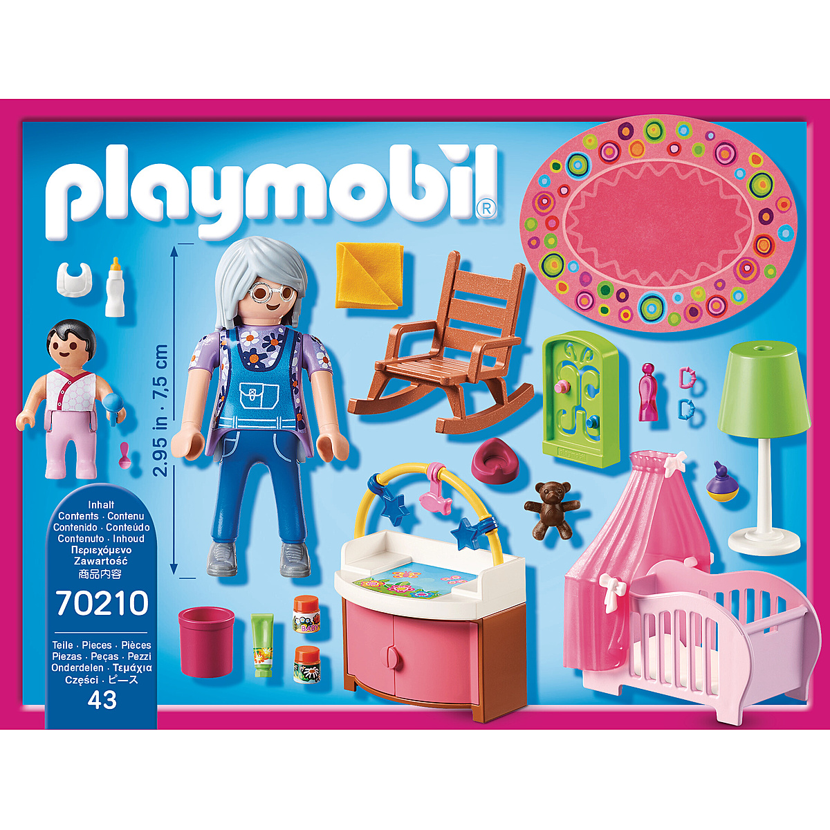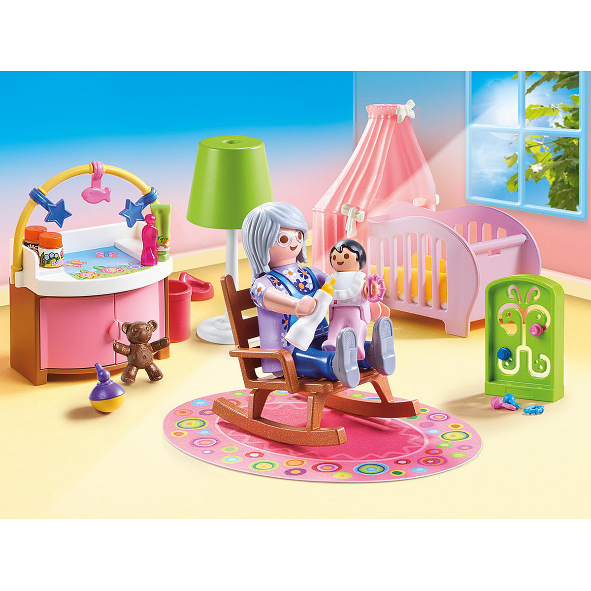 Contient 1 personnage, 1 bébé, 1 berceau, 1 fauteuil à bascule, 1 table à langer et des accessoires (tapis, jouets, biberon, couverture, produits…)