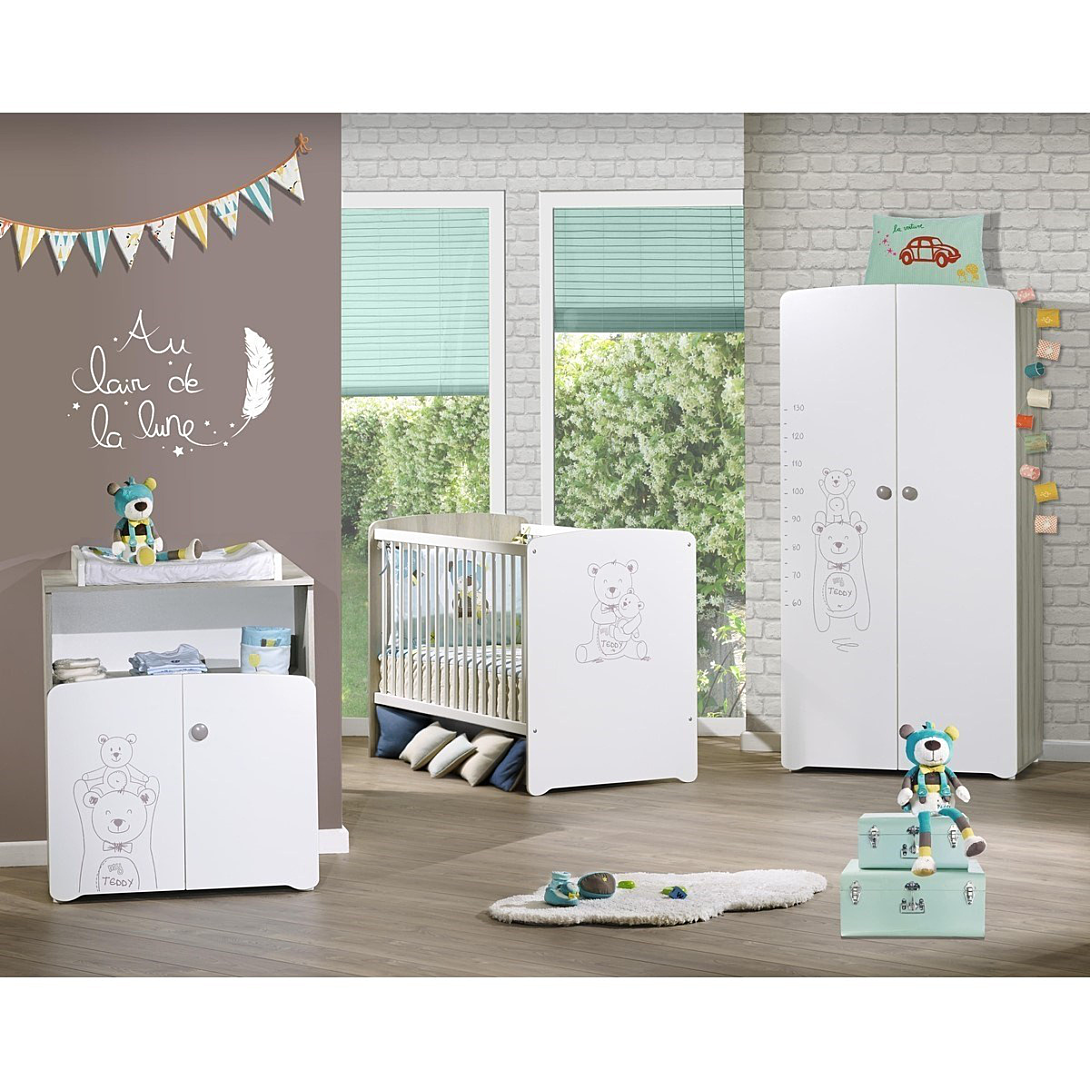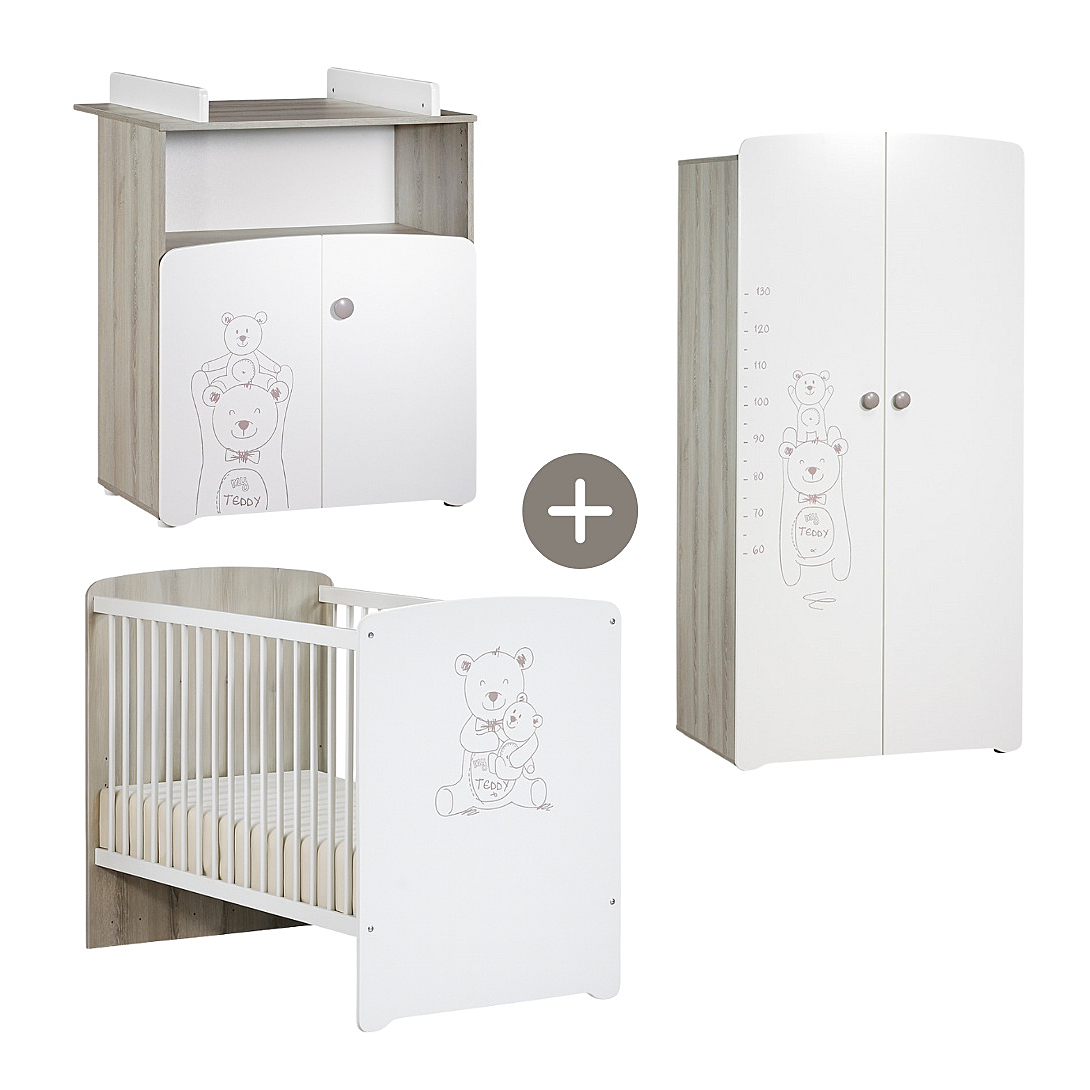 Une collection mixte pleine de tendresse aux tons frêne cendré et blanc. Bouton laqué taupe et décor "Teddy" par sérigraphie. A coup sûr, les deux ursidés veilleront sur les nuits de bébé !