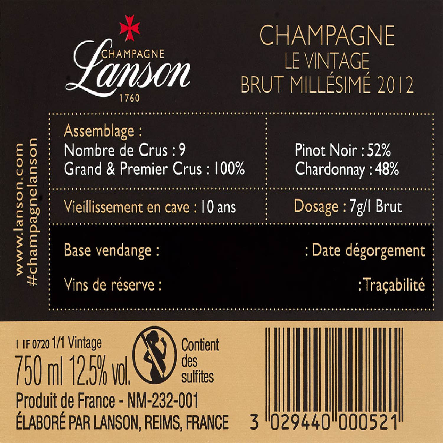 Libellé Champagne Lanson Millésimé - Brut, 2012 - 75 cl