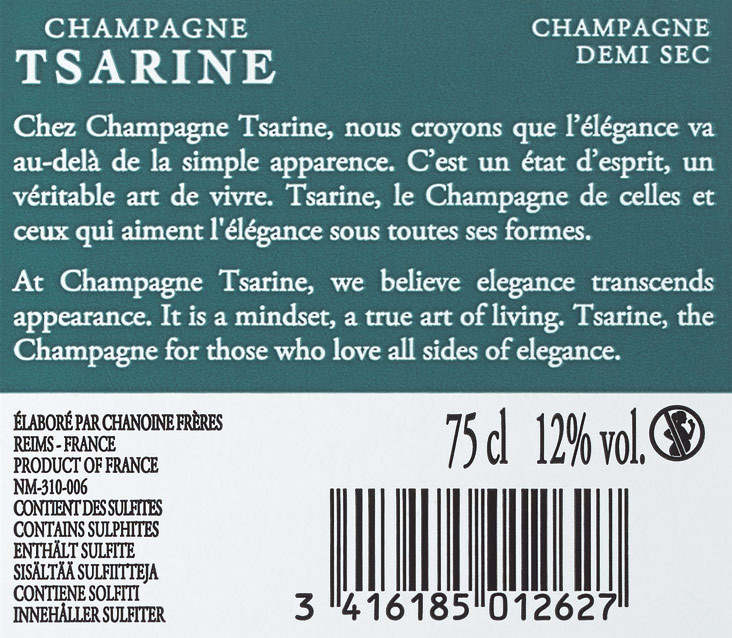 | Libellé | Champagne Tsarine - Demi-sec - 75 cl |