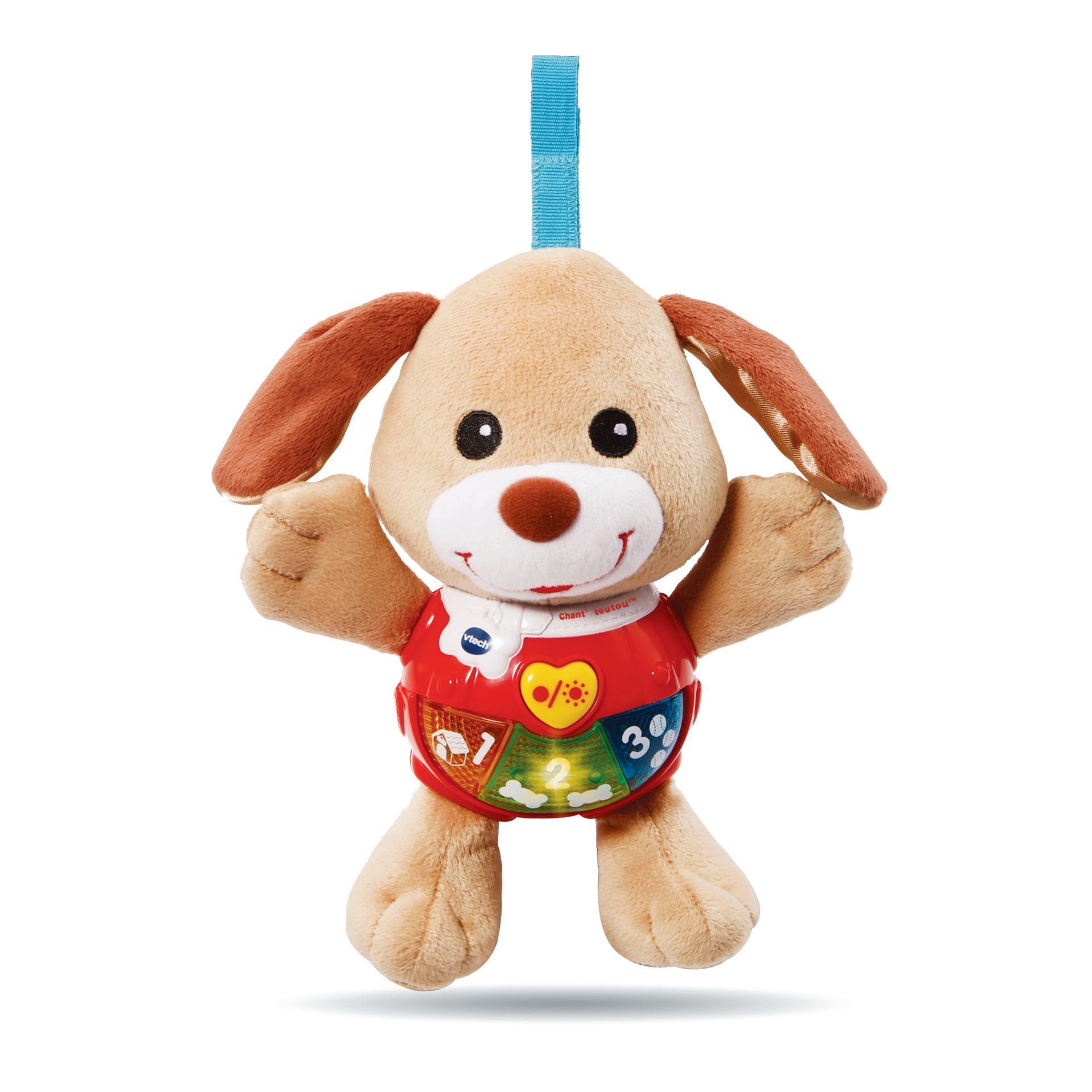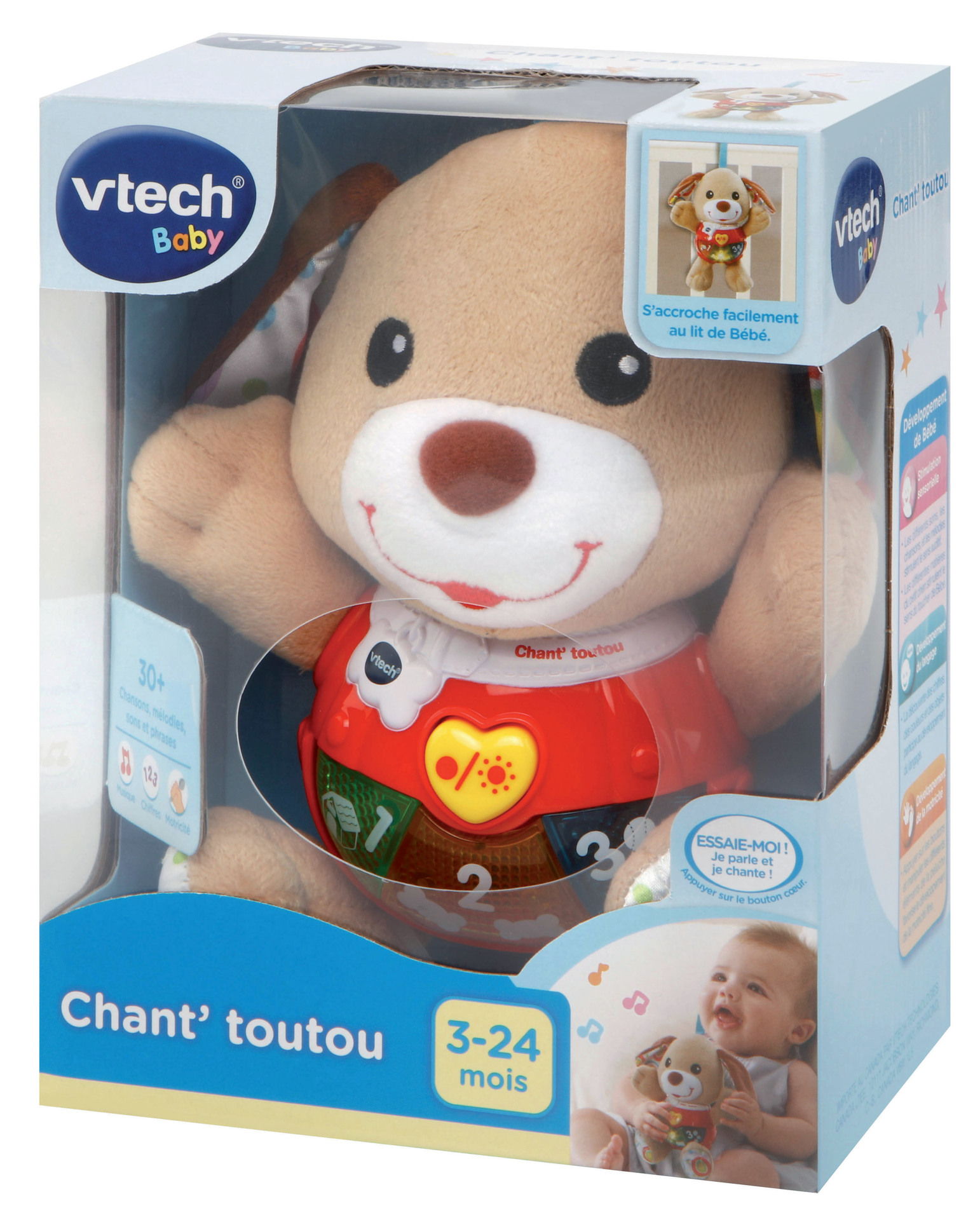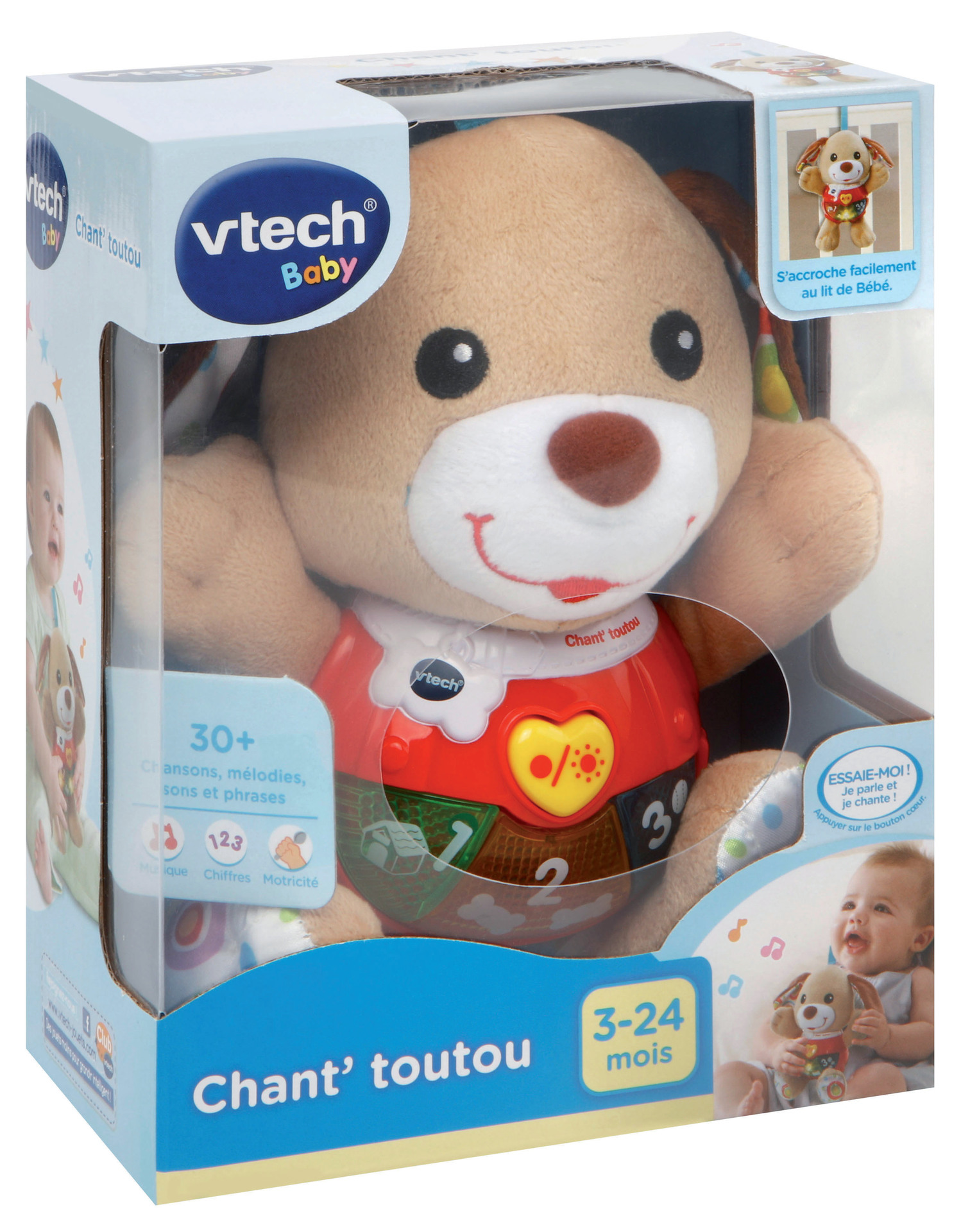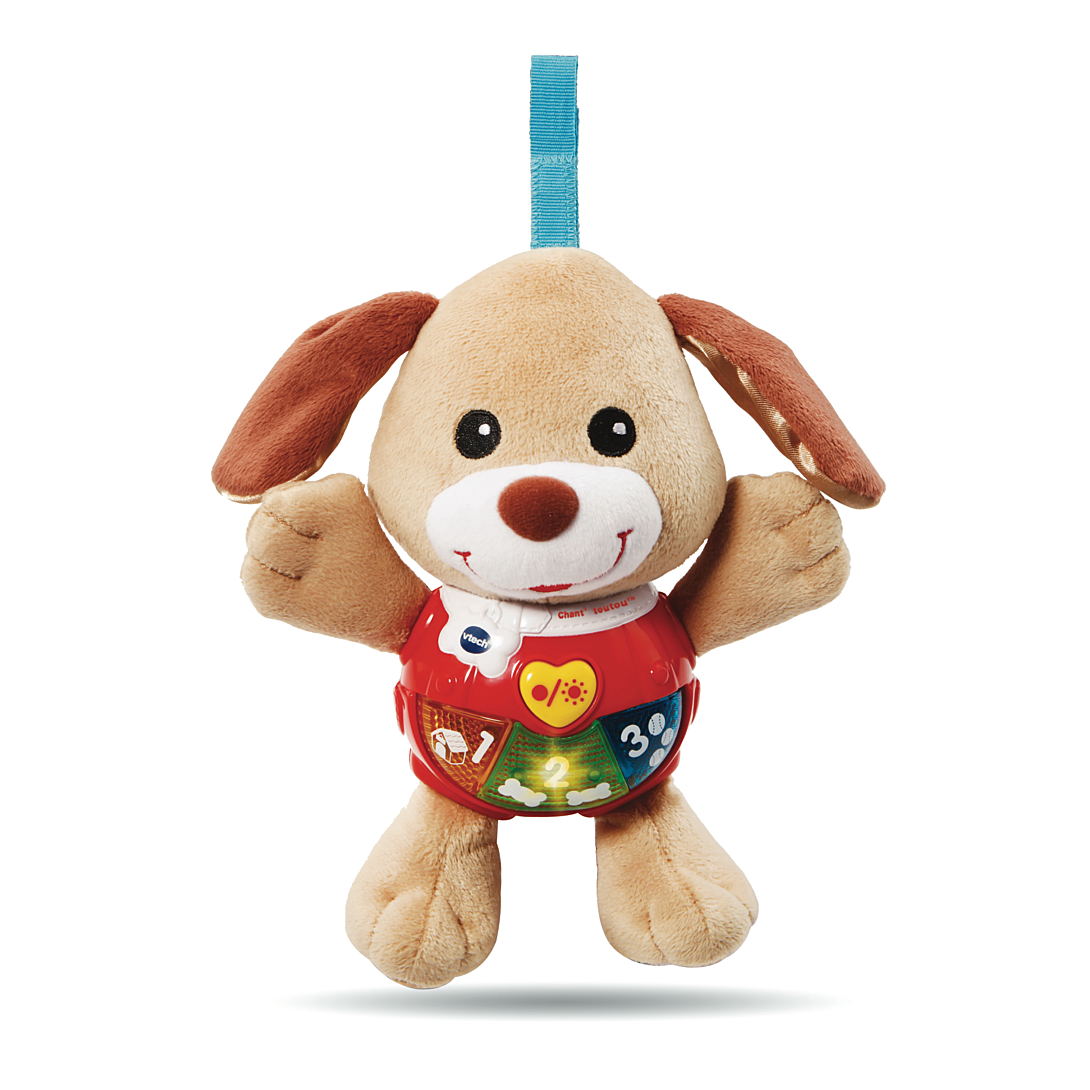 Chant' toutou - 3 - 24 mois Un petit chien tout doux pour des câlins en musique ! Avec 3 boutons lumineux pour découvrir les premiers chiffres, de nouveaux mots, des chansons et déclencher des mélodies. Des effets sonores de bisous. Différentes textures pour éveiller la curiosité de Bébé : corps en plastique, tête et pattes en tissu tout doux et oreilles en tissu satiné. Une sangle avec bande auto-agrippante pour l'attacher au lit, au parc ou à la poussette. 15 mélodies, 4 chansons et plein de sons rigolos. Arrêt automatique. Boîte Try-me. Fonctionne avec 2 piles LR03 fournies.